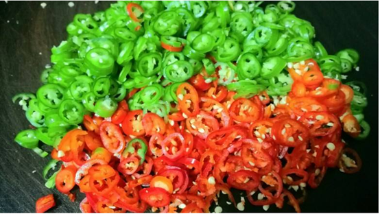 5、淋上紅油,并放入準(zhǔn)備好的青紅椒圈和大蔥圈