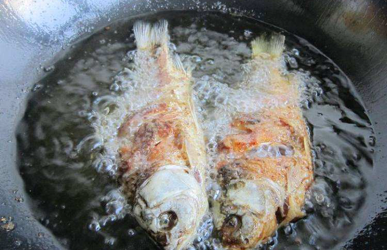 3、倒入適量的油,并將鯽魚兩面煎至金黃