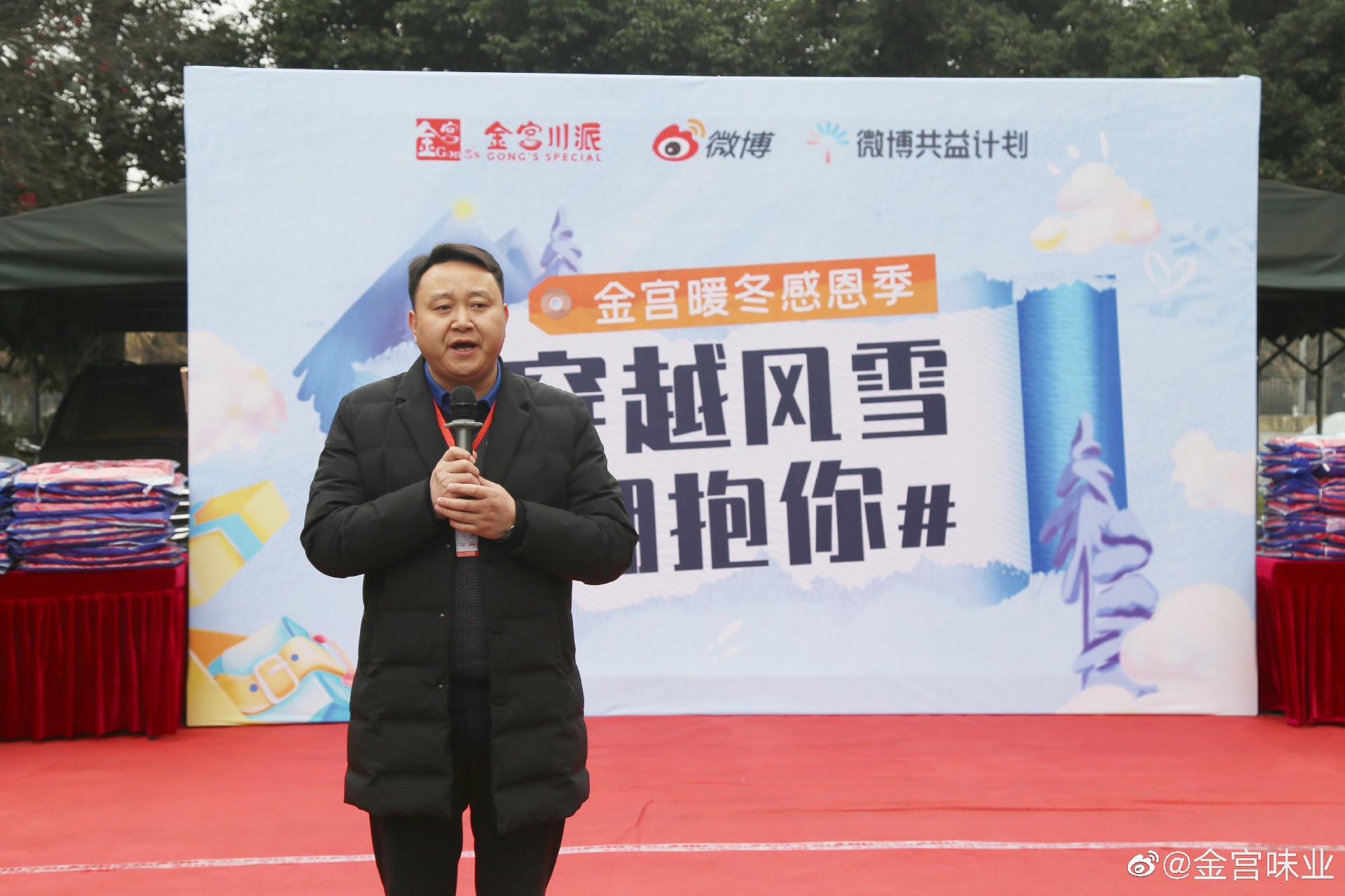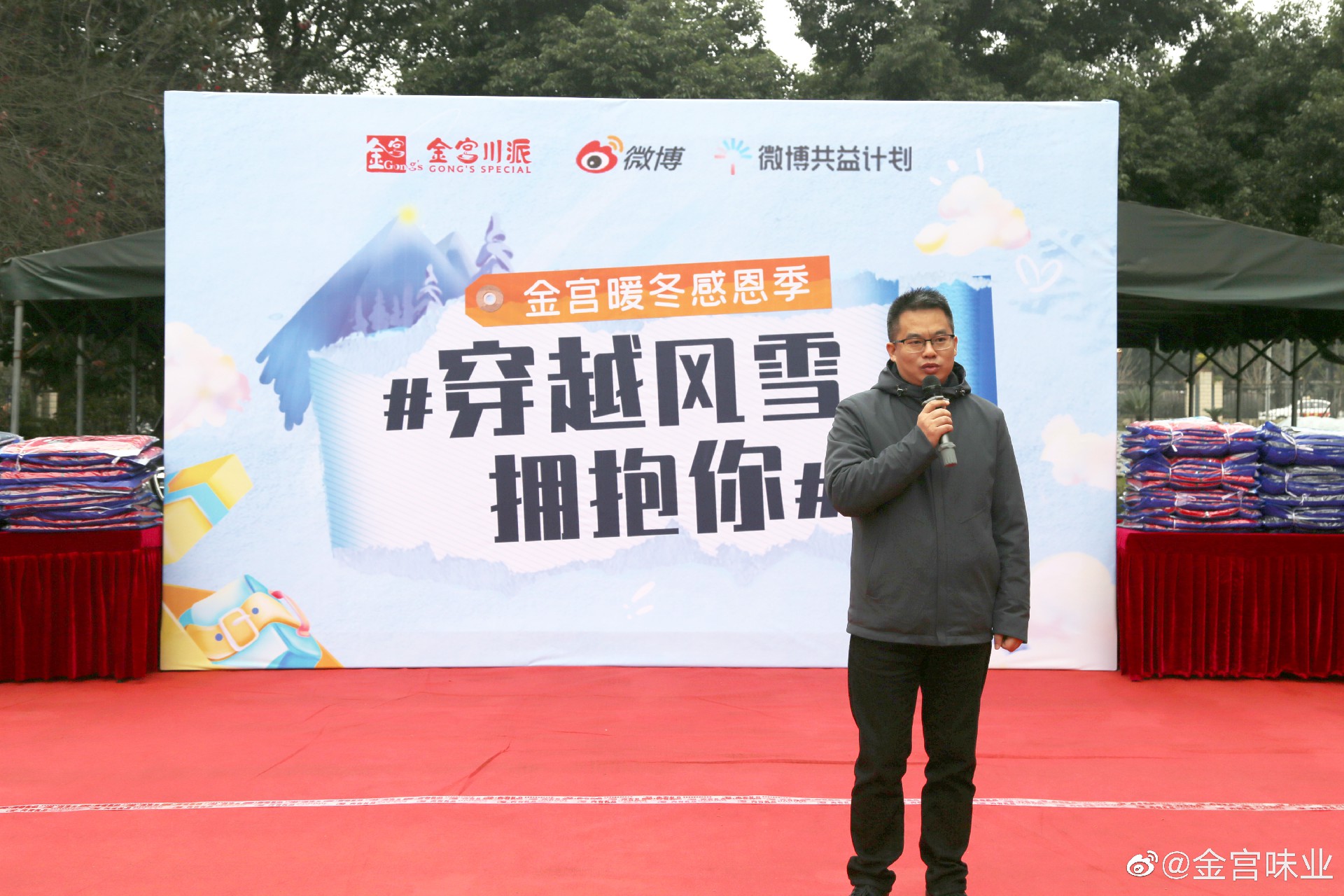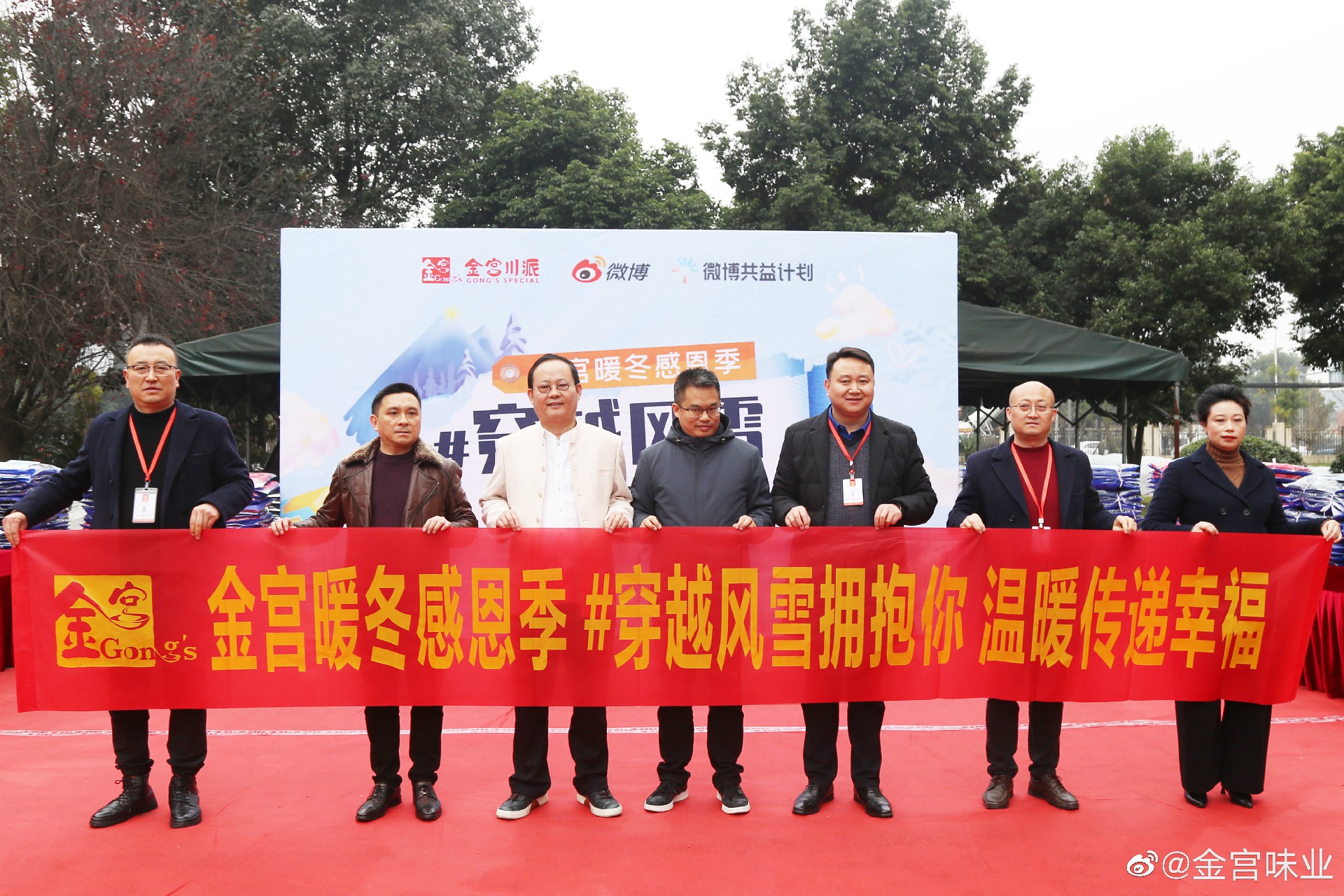 2022年1月7日,由新浪微公益,聯(lián)合中國天氣、微博政務等多個平臺共同發(fā)起的暖冬公益項目—穿越風雪擁抱你之金宮暖冬感恩季公益捐贈活動,在四川金宮川派味業(yè)有限公司舉行發(fā)車儀式,新浪四川副總經(jīng)理湯叢陽、四川電視臺峨眉電影頻道《四川味道》欄目總制片人鐘偉以及金宮集團董事長龔永澤、四大中心員工代表共同參與見證了此次活動。