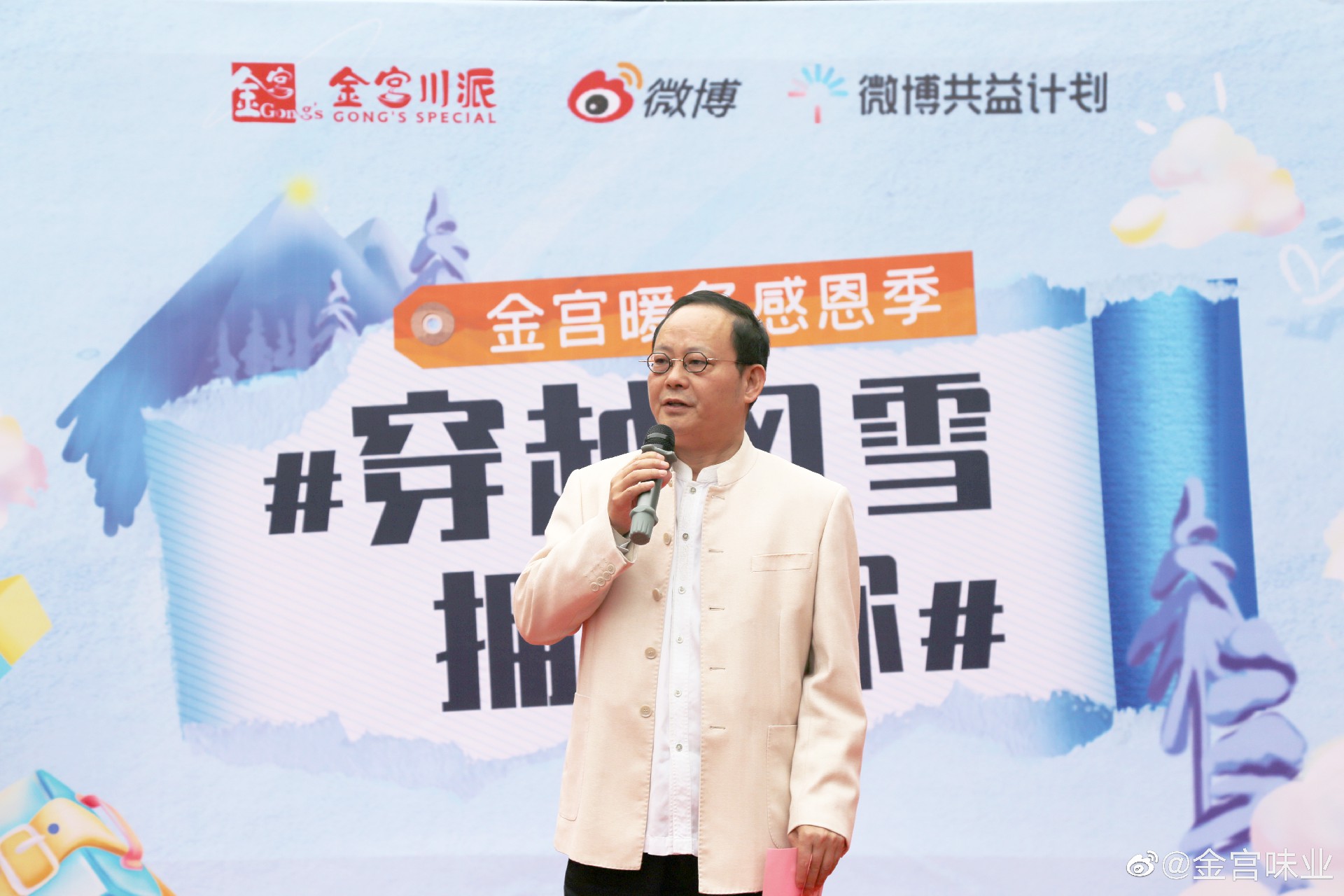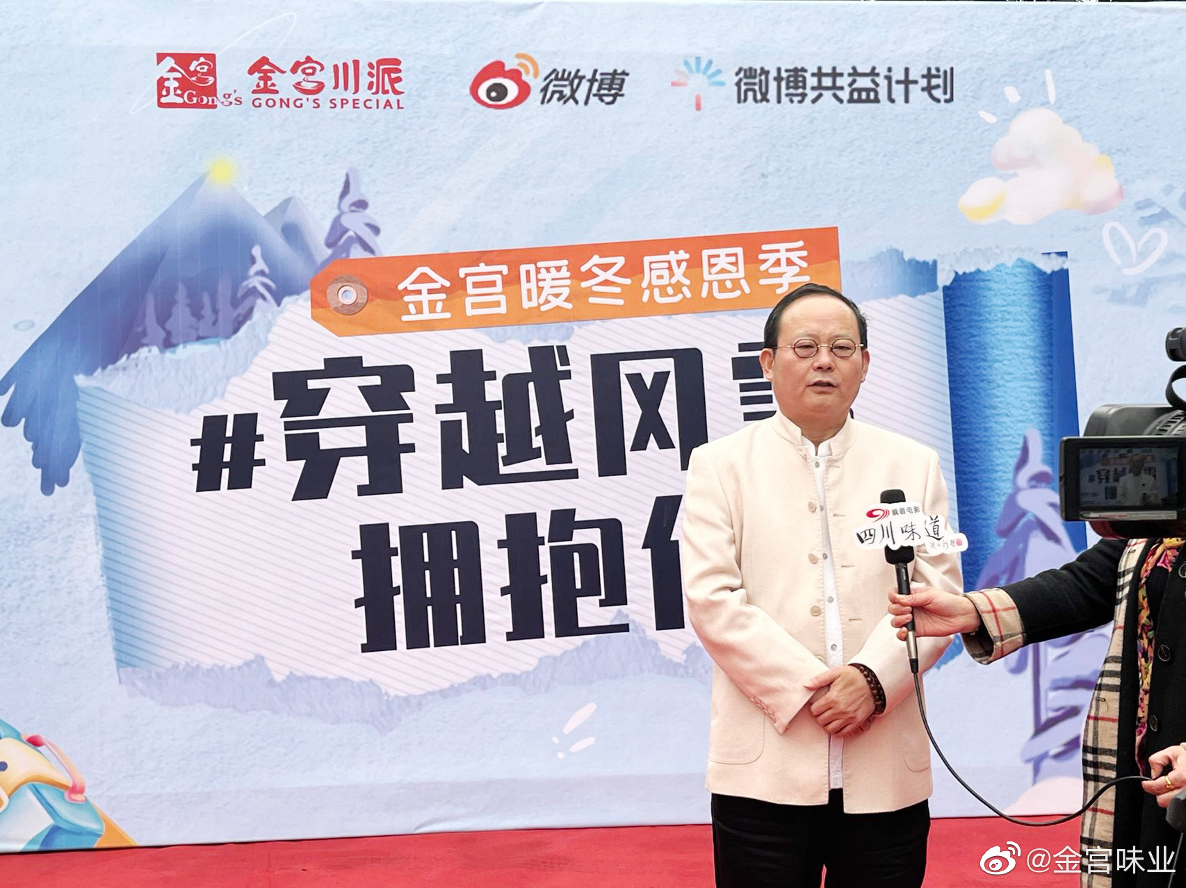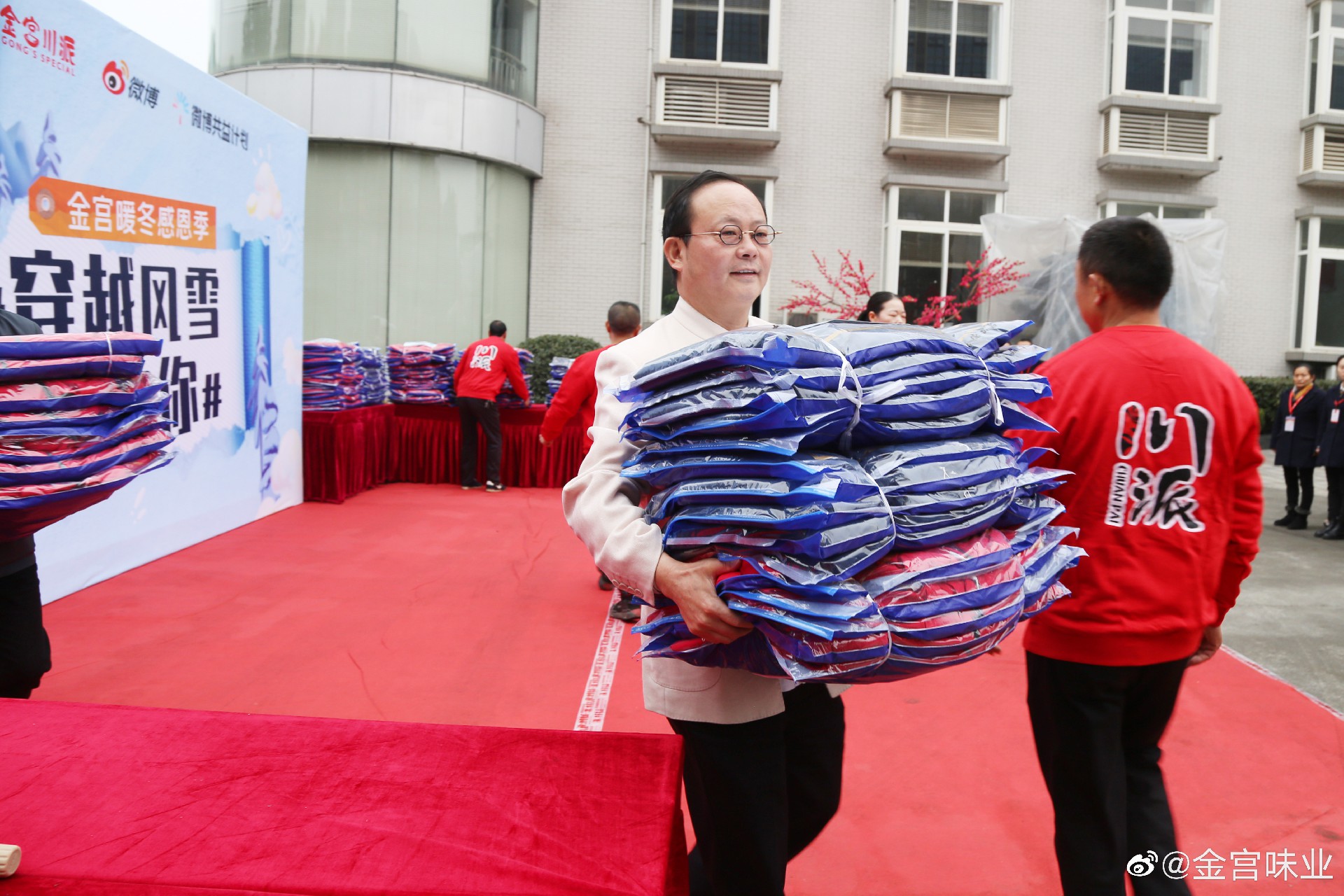 2022年1月7日,由新浪微公益,聯(lián)合中國天氣、微博政務等多個平臺共同發(fā)起的暖冬公益項目—穿越風雪擁抱你之金宮暖冬感恩季公益捐贈活動,在四川金宮川派味業(yè)有限公司舉行發(fā)車儀式,新浪四川副總經(jīng)理湯叢陽、四川電視臺峨眉電影頻道《四川味道》欄目總制片人鐘偉以及金宮集團董事長龔永澤、四大中心員工代表共同參與見證了此次活動。