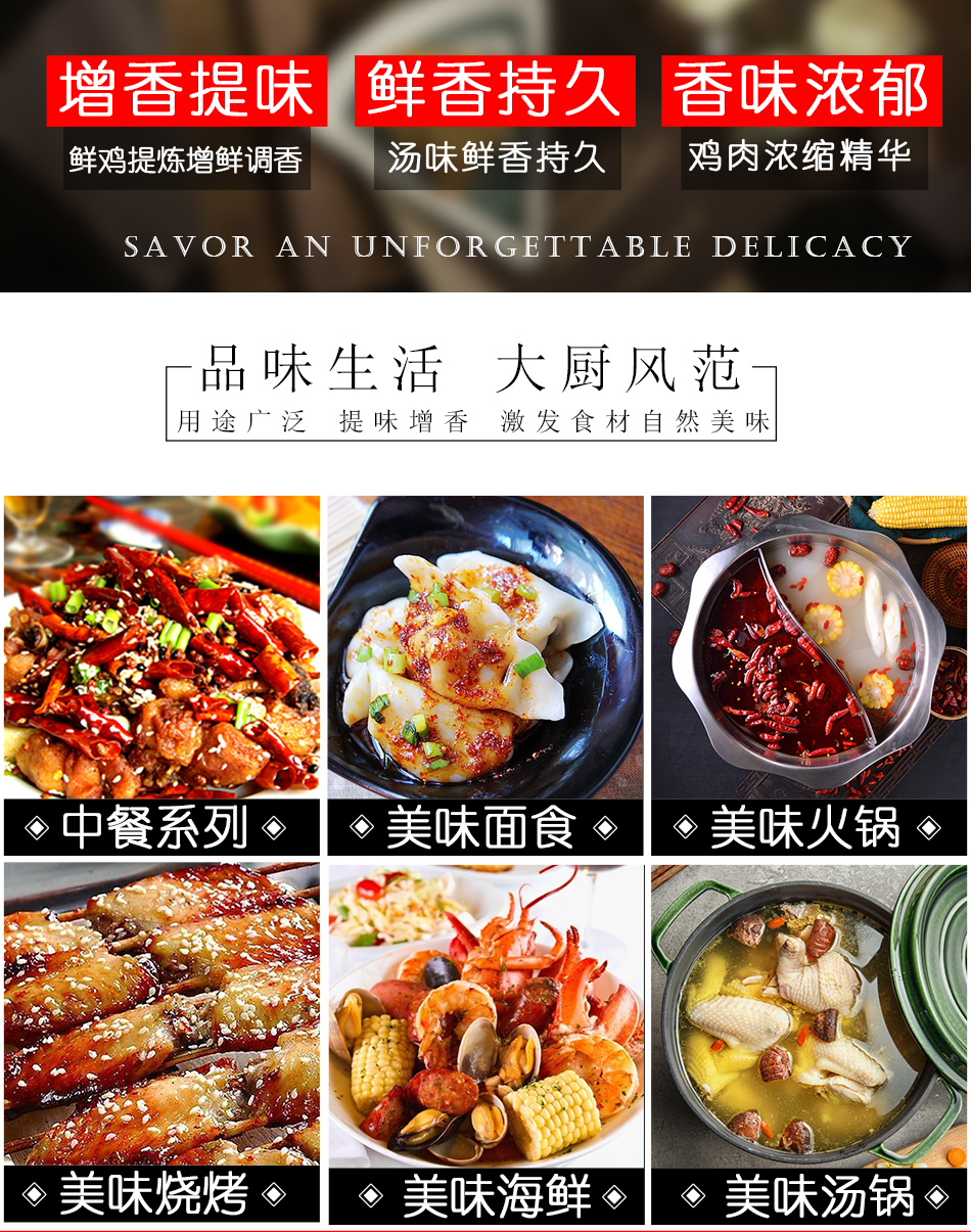 產(chǎn)品簡介:本品采用濃縮雞肉,集雞的鮮味、香味和營養(yǎng)于一體,口感鮮香,持久耐煮,是家庭、酒樓、餐飲、火鍋、點(diǎn)心及食品加工的調(diào)味佳品。