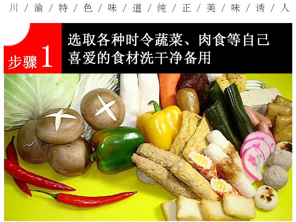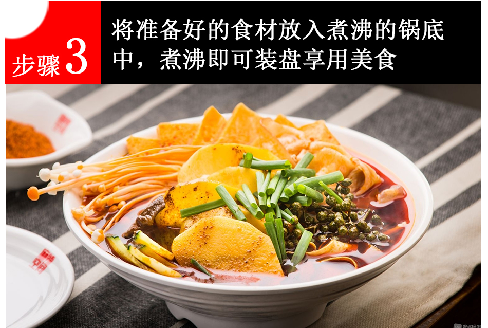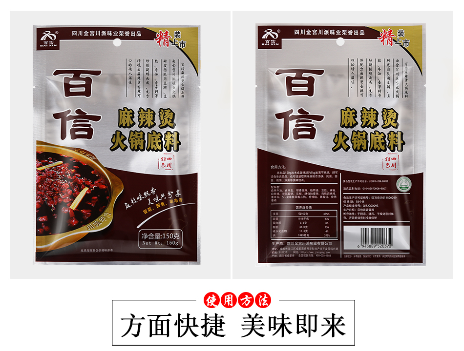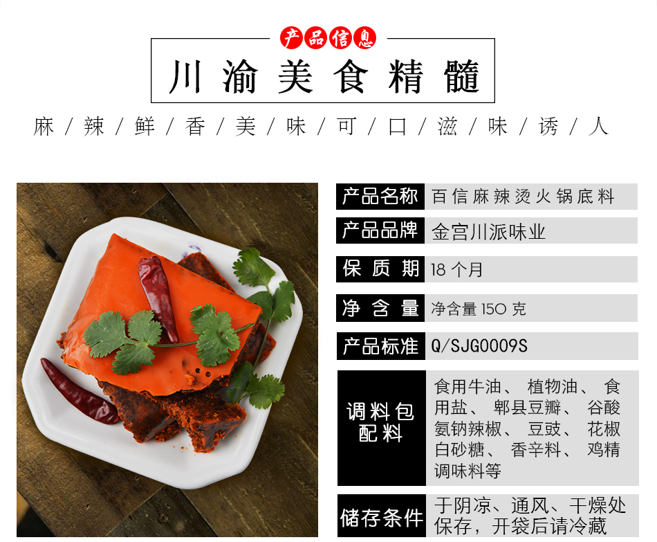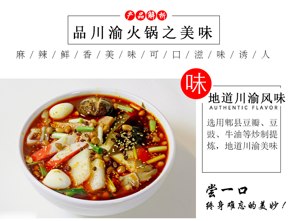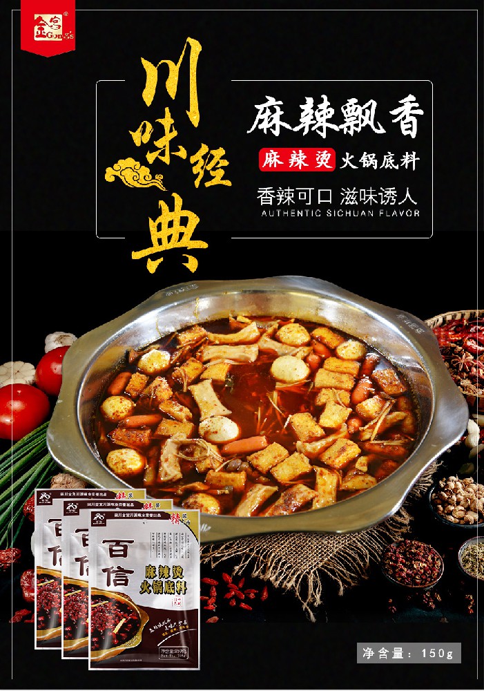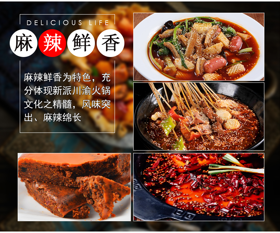 產品簡介:本品采用天然香料,經火鍋配料師反復研究,結合現(xiàn)代工藝精制而成。本品以麻、辣、鮮、香為特色,充分體現(xiàn)了新派川渝火鍋文化之精髓。它風味突出,麻辣綿長,是餐館、家庭制作火鍋的理想底料。