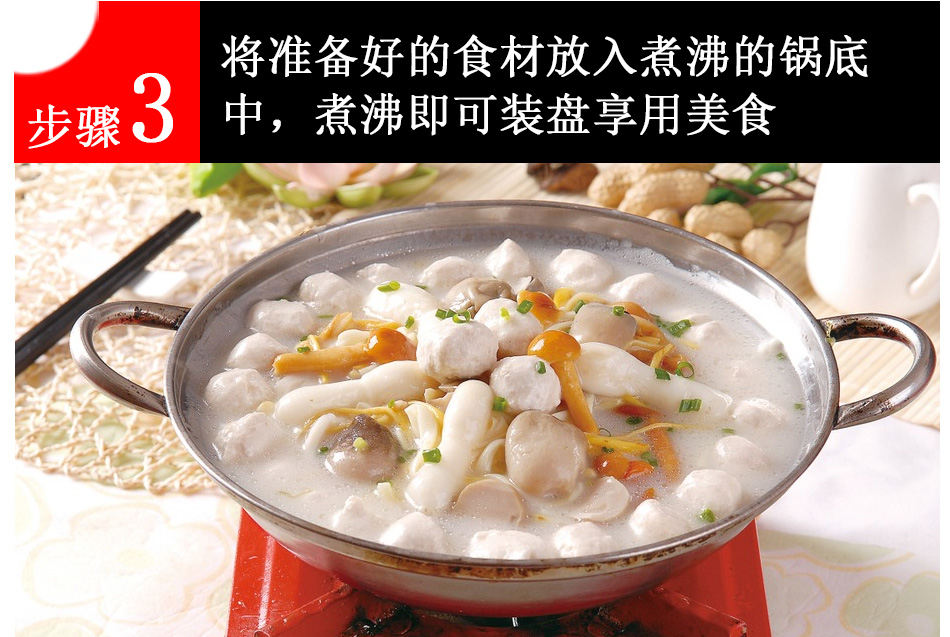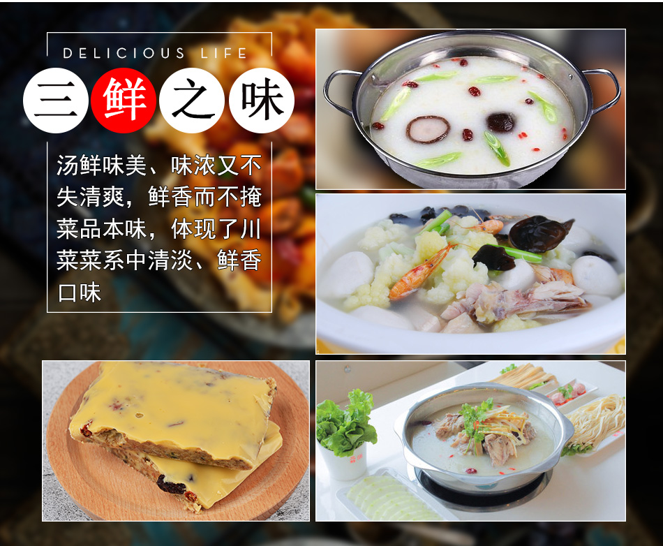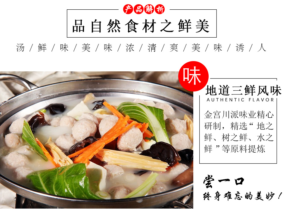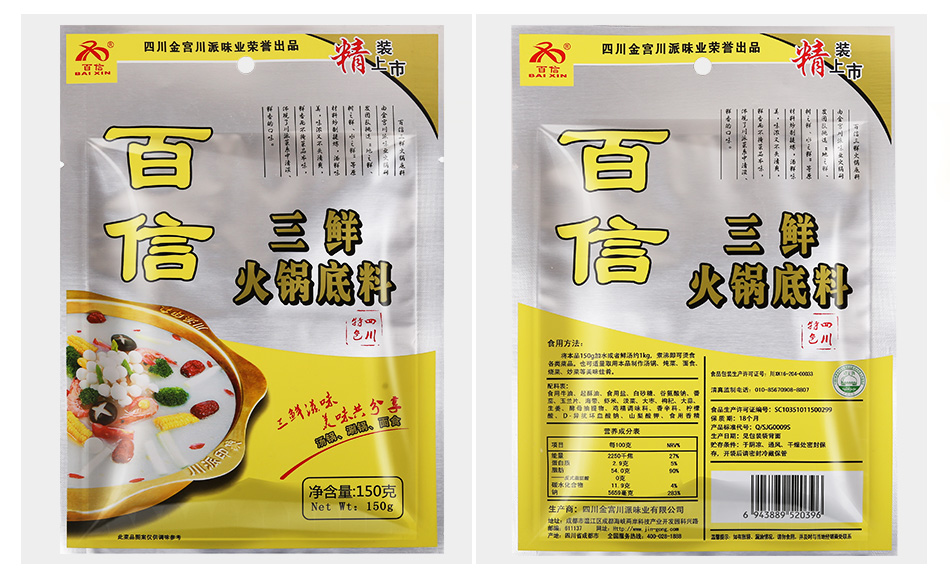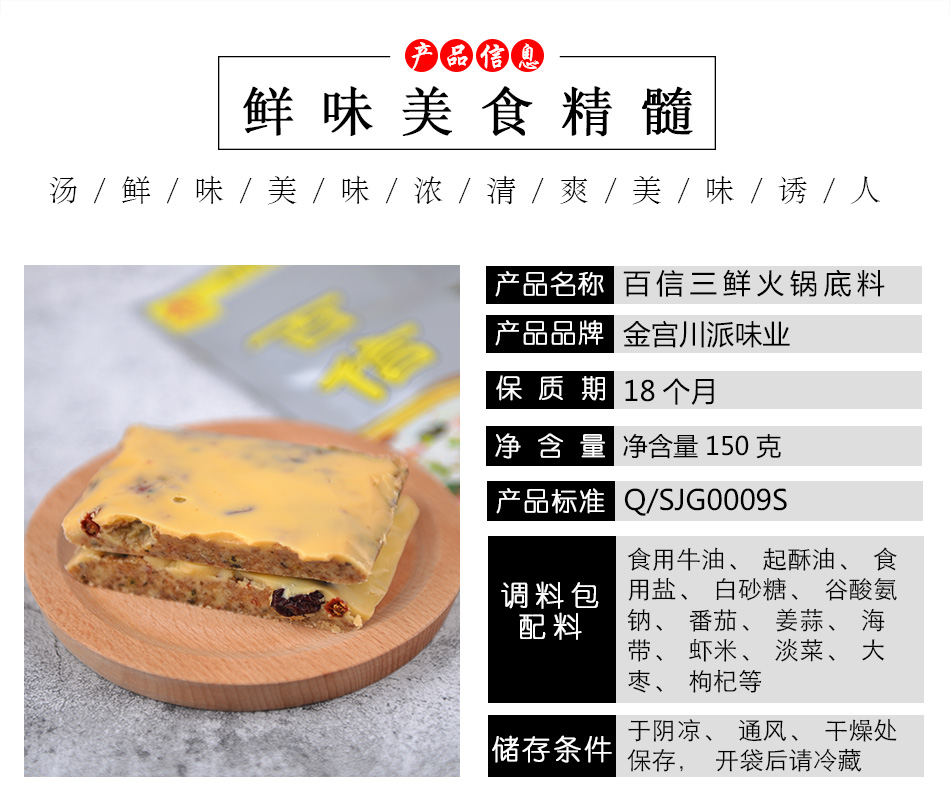 產(chǎn)品簡(jiǎn)介:百信三鮮火鍋底料是采用天然原料,經(jīng)川派火鍋特級(jí)配料師多年潛心研究、反復(fù)實(shí)驗(yàn)而開發(fā)出的新派火鍋底料。以科學(xué)配方,結(jié)合現(xiàn)代制作工藝,在繼承傳統(tǒng)火鍋特點(diǎn)的基礎(chǔ)上,體現(xiàn)新一代三鮮底料濃郁鮮香,湯醇味美的獨(dú)特風(fēng)味。