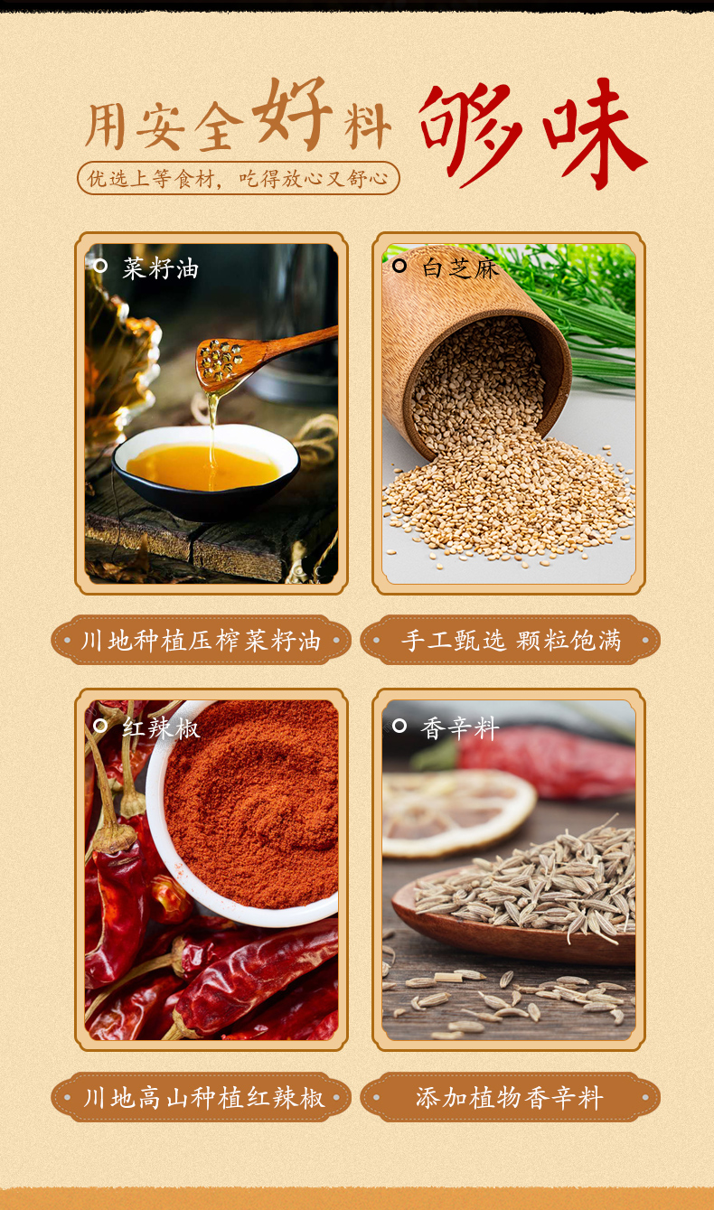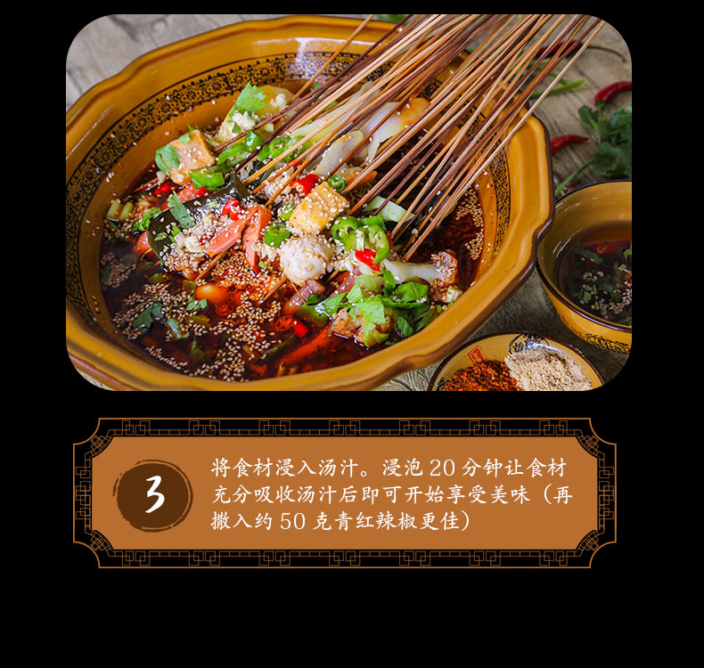 產(chǎn)品簡(jiǎn)介:本調(diào)料是金宮川派公司川菜研發(fā)團(tuán)隊(duì)收集成都、樂山缽缽雞的做法,以紅油的香辣紅亮為特色,成菜麻辣鮮香,鮮嫩爽口,香氣四溢,讓人饞涎欲滴。