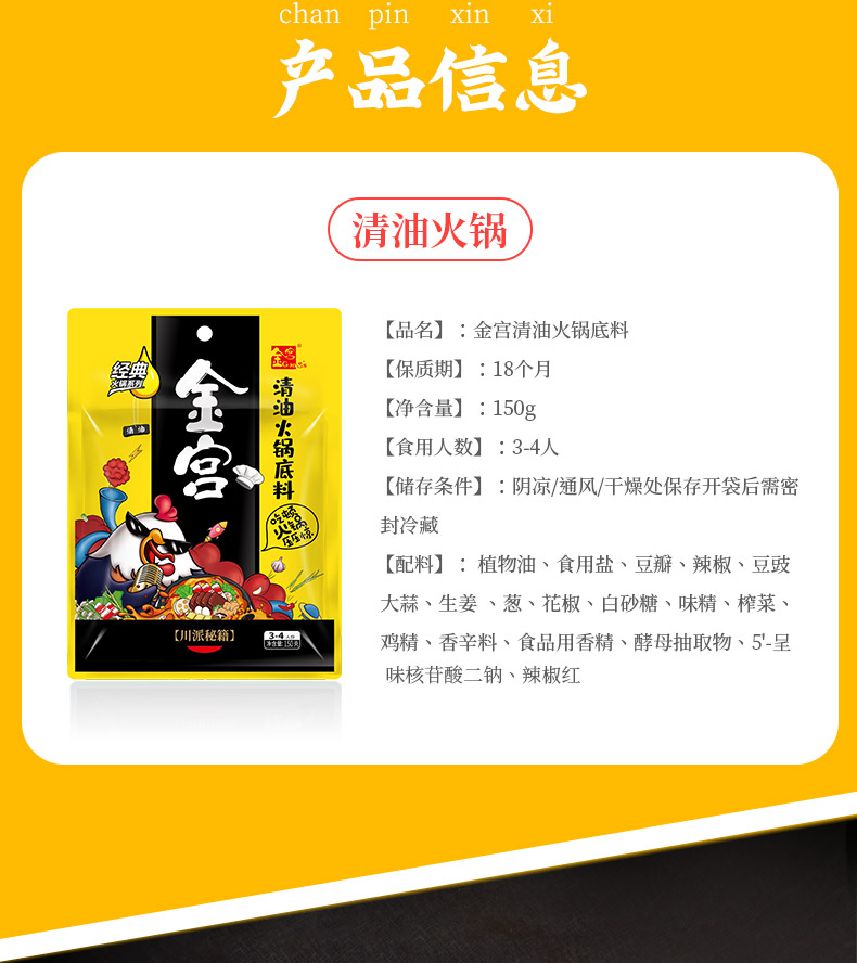 金宮麻辣清油火鍋底料-金宮品牌-四川金宮川派味業(yè)有限公司_金宮,金宮雞精,金宮味精,金宮火鍋底料,金宮香腸臘肉調(diào)料,金宮小龍蝦調(diào)料,金宮魚調(diào)料,金宮調(diào)料定制,金宮調(diào)味品定制-四川金宮川派味業(yè)有限公司_金宮,金宮雞精,金宮味精,金宮火鍋底料,金宮香腸臘肉調(diào)料,金宮小龍蝦調(diào)料,金宮魚調(diào)料,金宮調(diào)料定制,金宮調(diào)味品定制