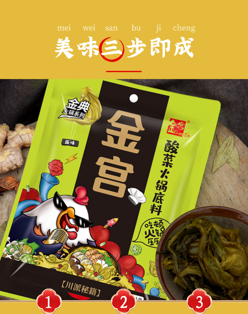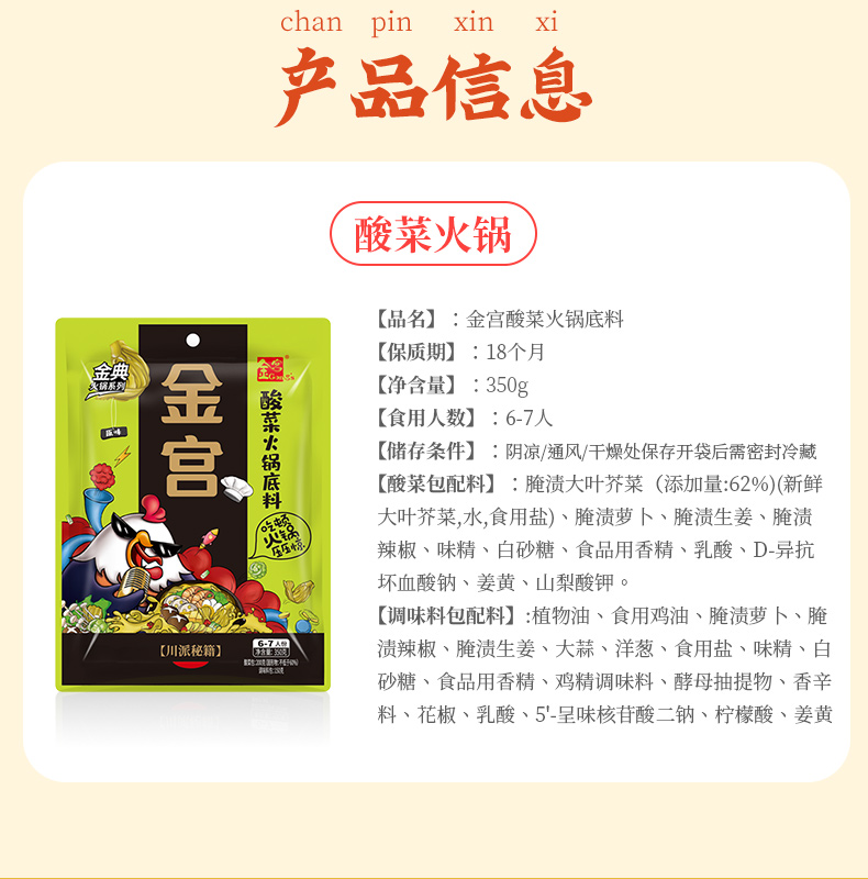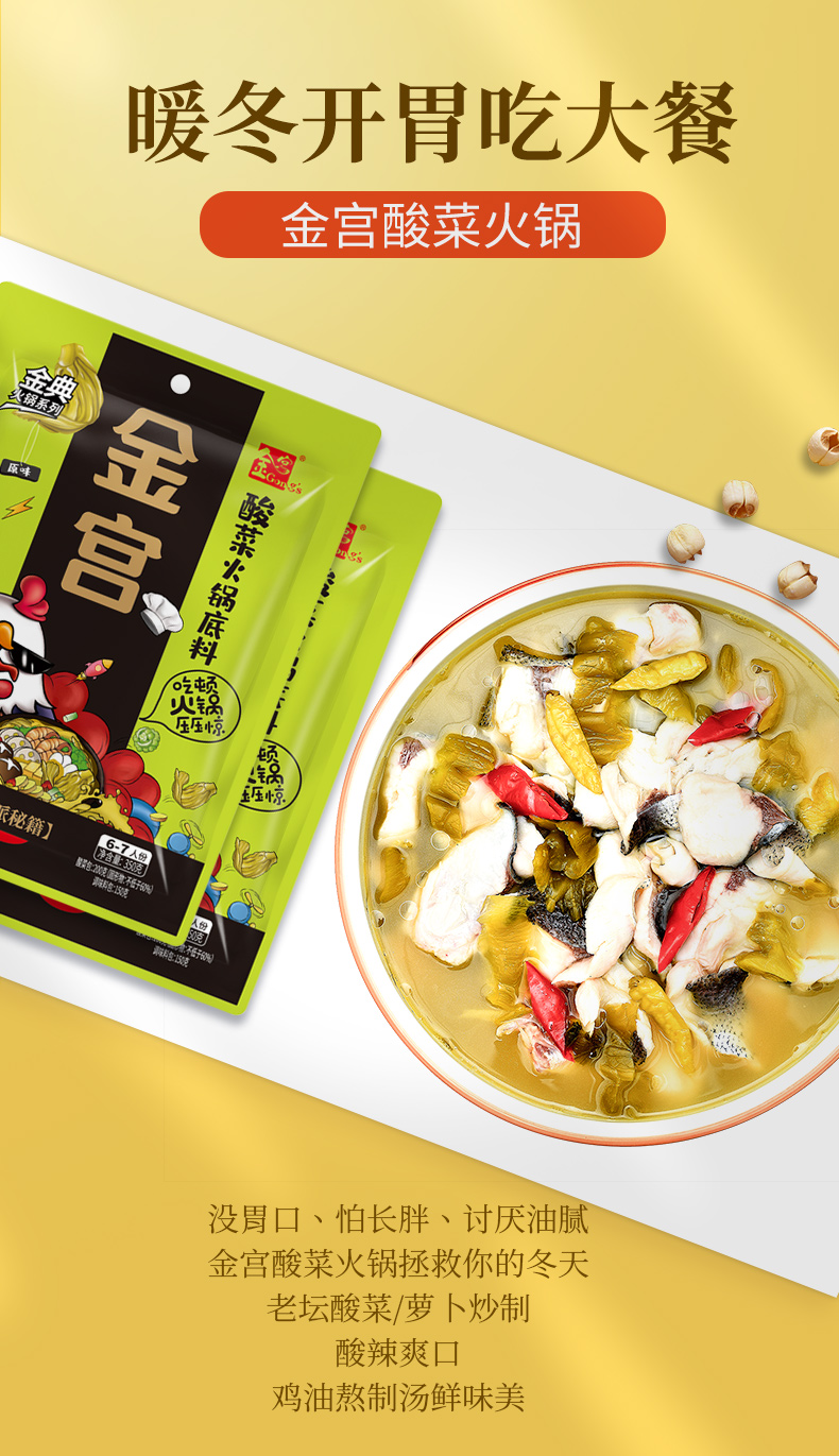 產(chǎn)品簡介:金宮酸菜火鍋底料是金宮川派公司研發(fā),嚴選四川本地腌漬青菜、腌漬姜、腌漬蘿卜等多種食材精制濃縮而成。觀其色湯白濃醇,酸菜青綠;聞其香酸香沁脾、誘人食欲;嘗其味酸香爽脆、湯濃醇鮮。