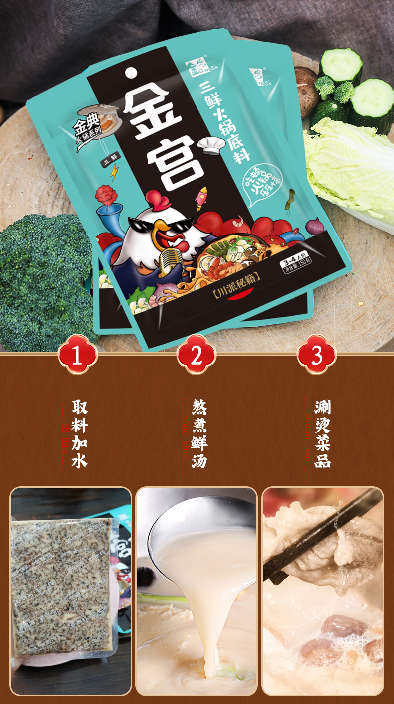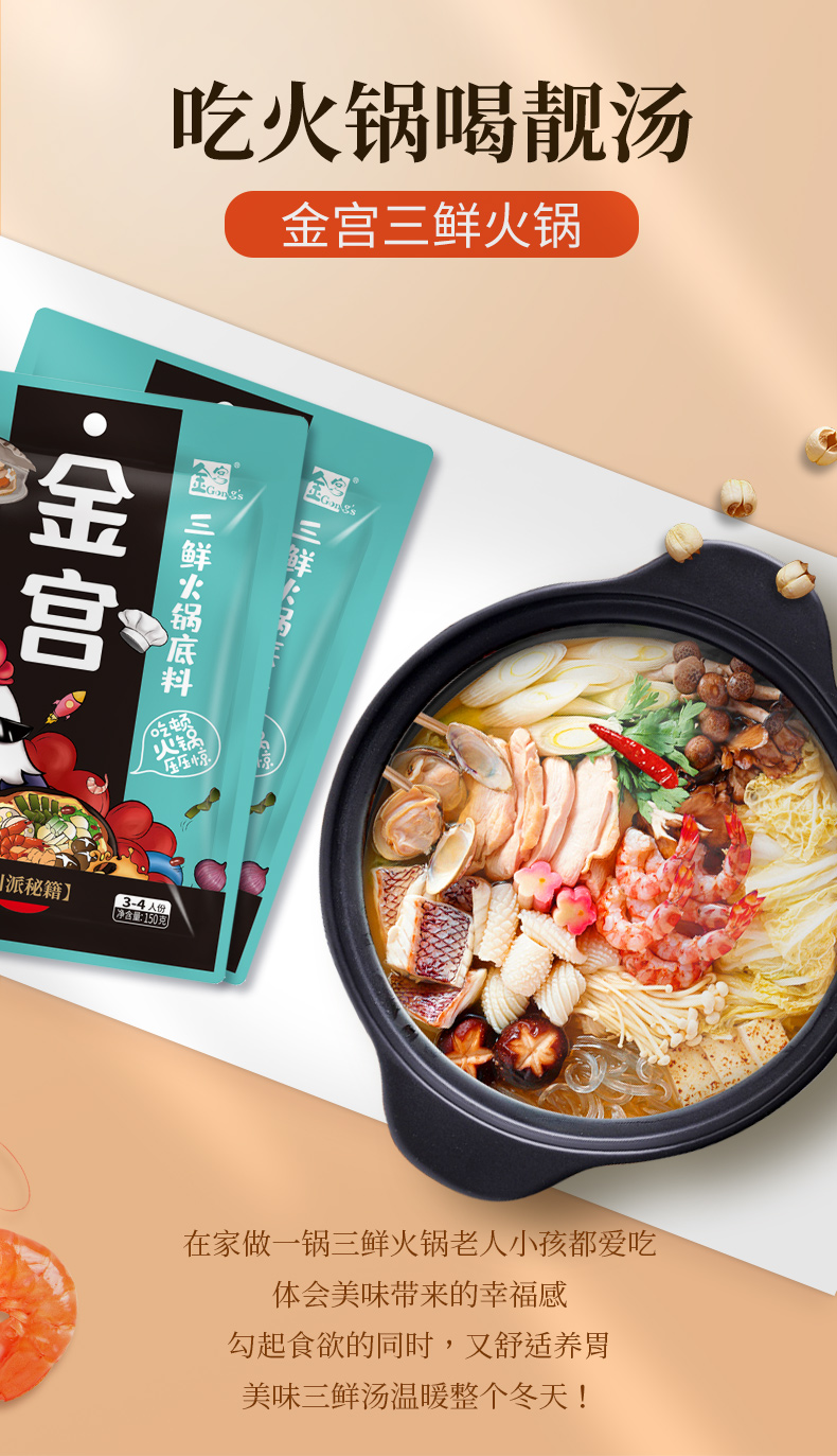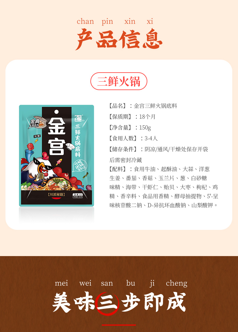 產(chǎn)品簡介:金宮三鮮火鍋底料是金宮川派公司研發(fā),挑選"地之鮮”、“樹之鮮”、"水之鮮"等原材料炒制提煉,湯鮮味美,味濃而不失清爽,鮮香而不掩菜品本味,體現(xiàn)了川派菜品鮮香味濃、清爽夠味的特點。