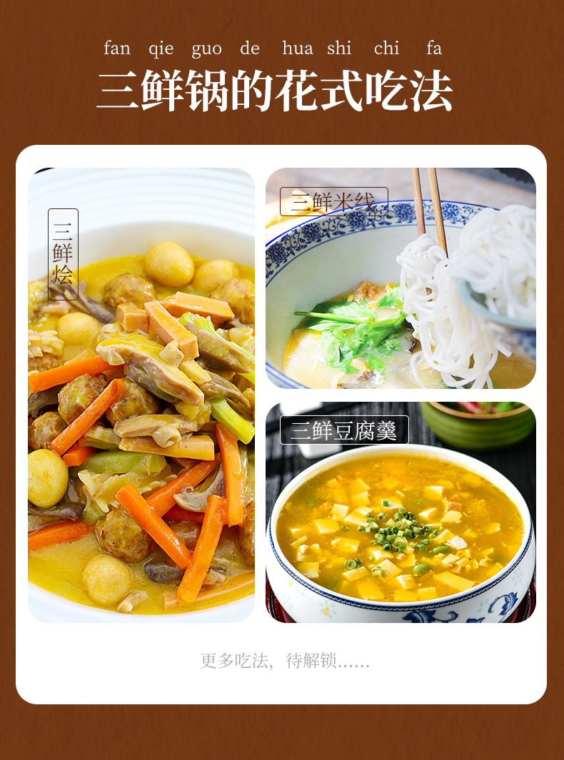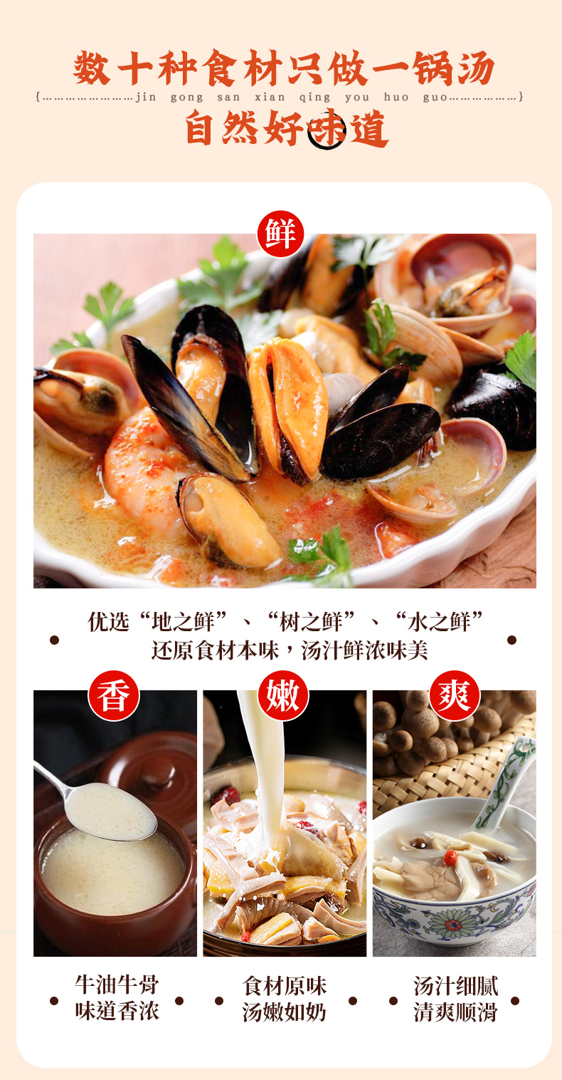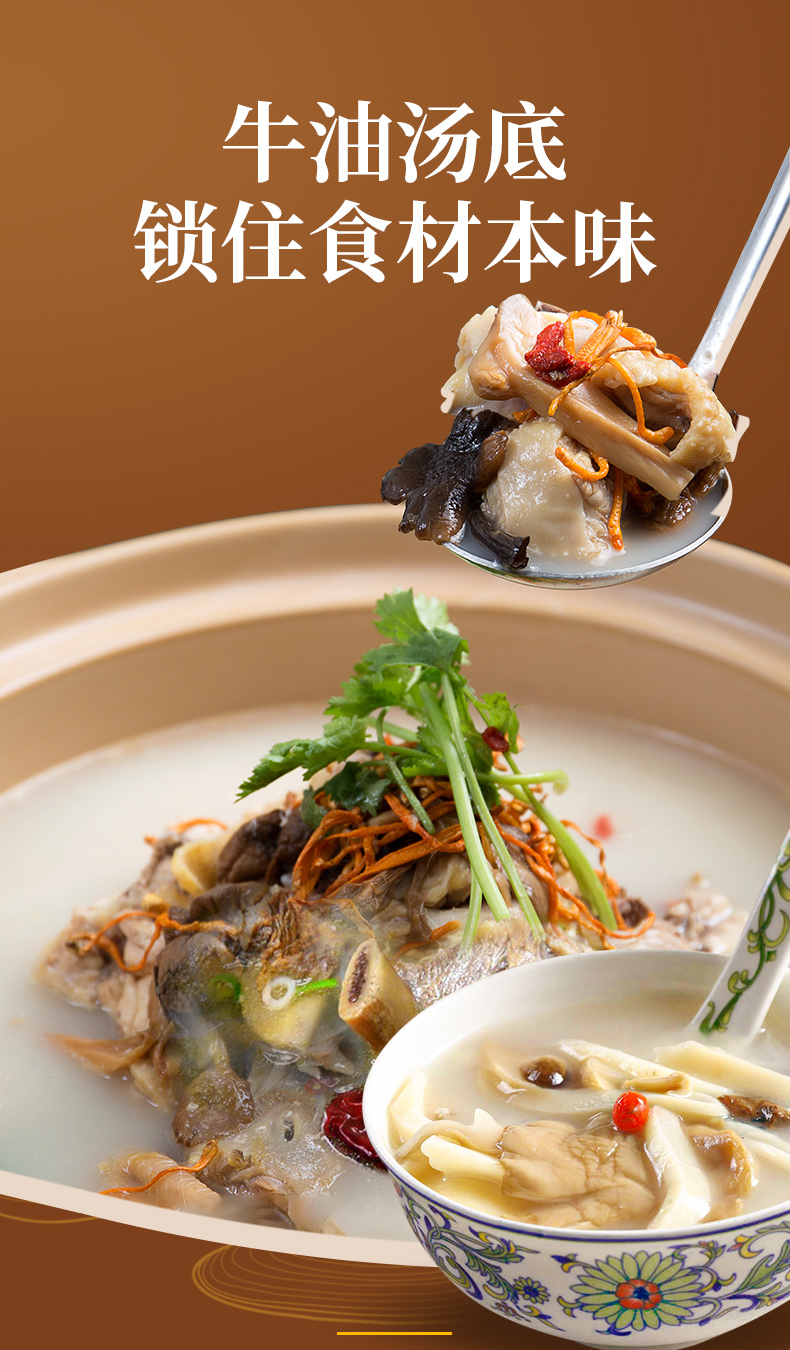 產(chǎn)品簡介:金宮三鮮火鍋底料是金宮川派公司研發(fā),挑選"地之鮮”、“樹之鮮”、"水之鮮"等原材料炒制提煉,湯鮮味美,味濃而不失清爽,鮮香而不掩菜品本味,體現(xiàn)了川派菜品鮮香味濃、清爽夠味的特點。