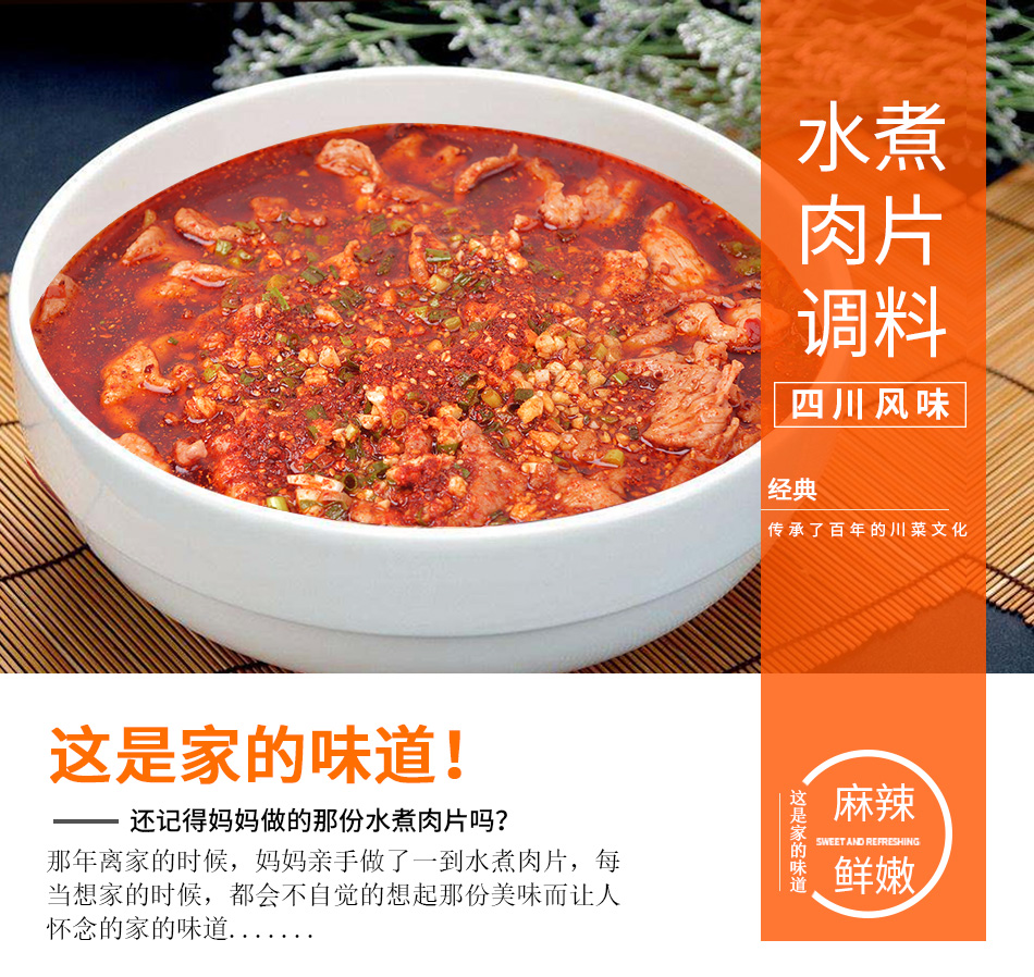 產(chǎn)品簡介:四川名菜—水煮肉片,起源于四川自貢,是一道地方名菜,其特色麻辣鮮香,為四川家常美食之一。金宮水煮肉片調(diào)料傳承經(jīng)典,創(chuàng)新研制,烹飪簡單易上手,湯紅油亮,麻辣味濃,椒香突出,和家人朋友一起分享美味。