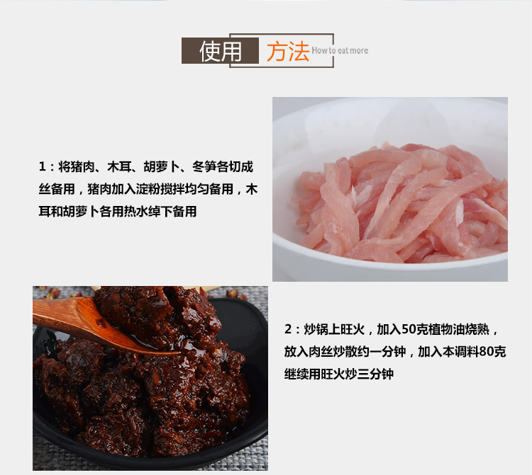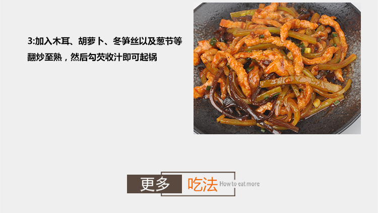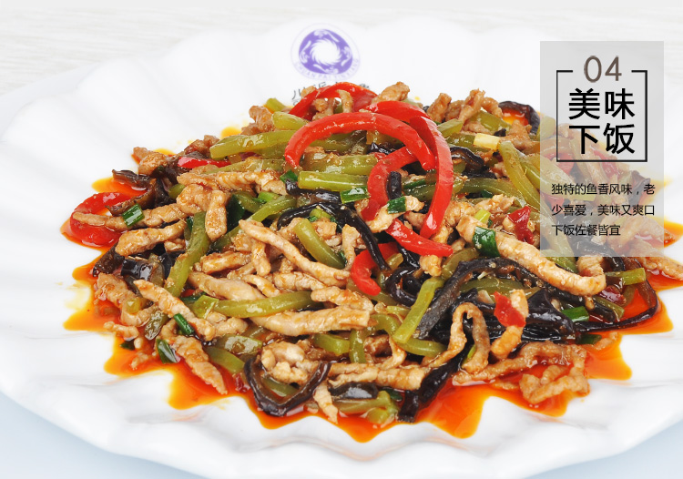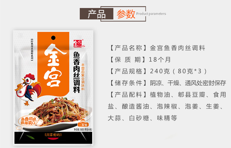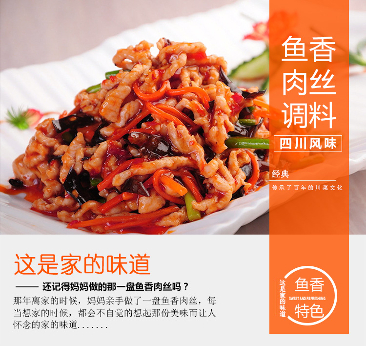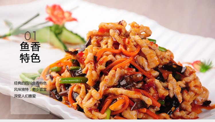 產(chǎn)品簡介:四川名菜—魚香肉絲,是一道四川特色傳統(tǒng)名菜,以魚香調(diào)味而得名,風味獨特、老少咸宜,深受人們喜愛。金宮魚香肉絲調(diào)料傳承經(jīng)典,創(chuàng)新研制,成菜色澤紅潤,富魚香味,姜蔥蒜味濃郁,咸甜酸辣兼得,下飯佐餐皆宜。