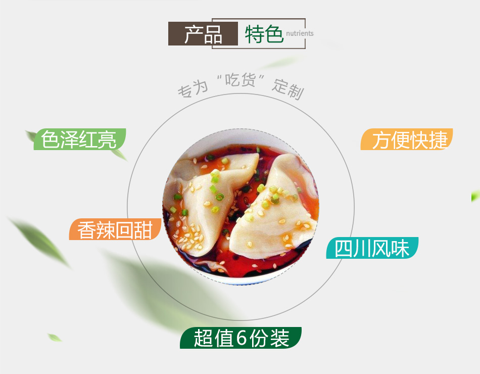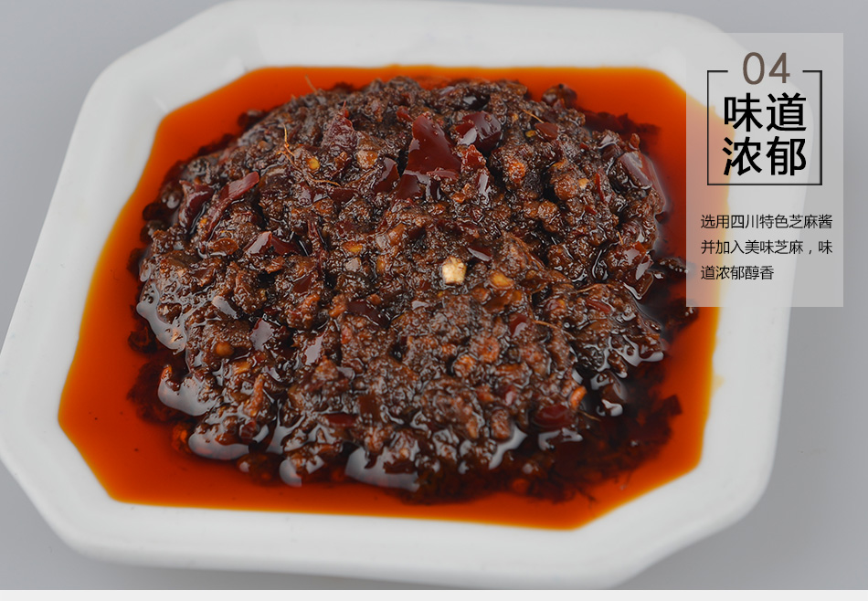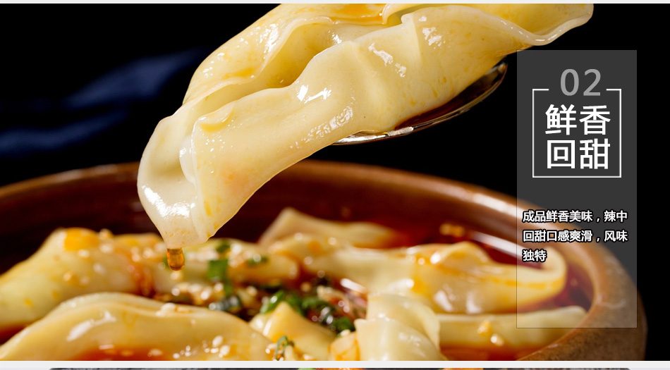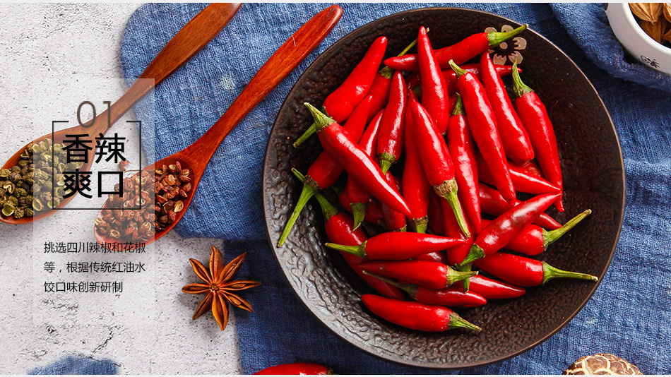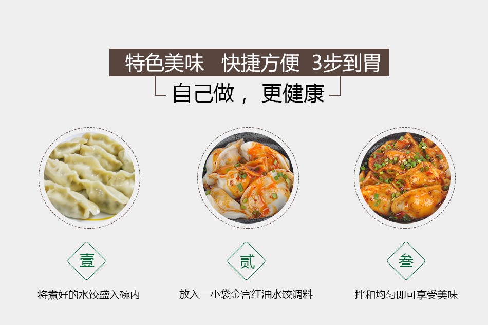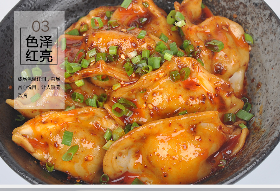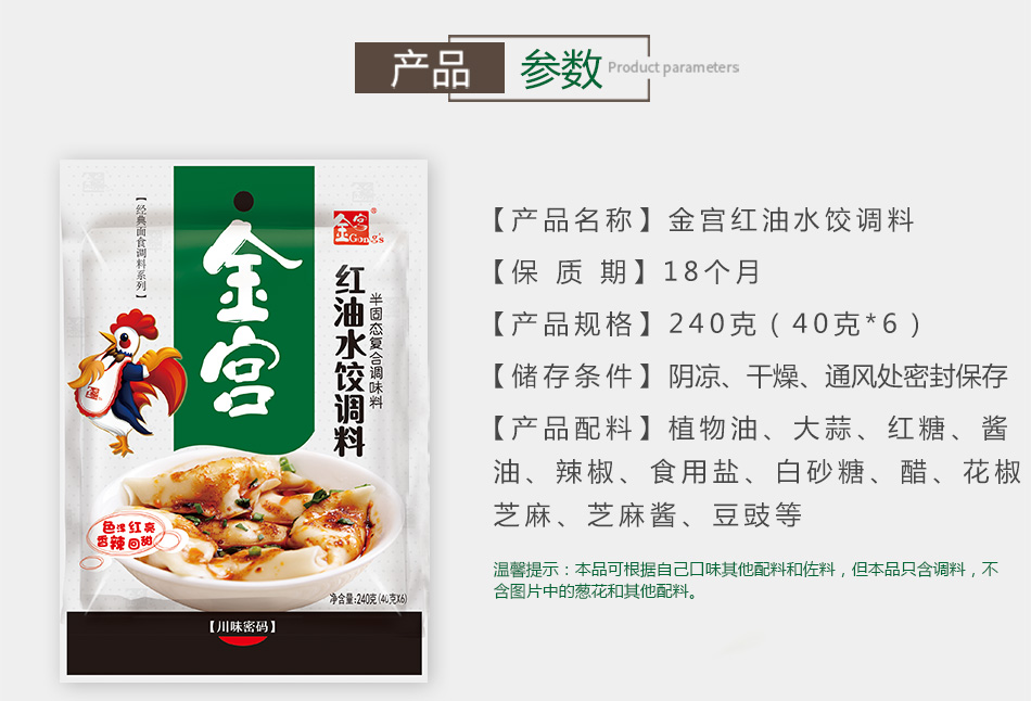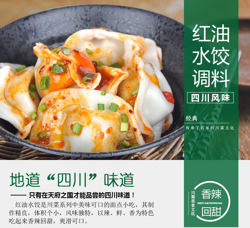 產(chǎn)品簡介:紅油水餃,是川菜系列中美味可口的面點小吃,其制作精細,體輕個小,風味獨特,是一道不能錯過的美味。金宮紅油水餃調(diào)料,傳承經(jīng)典,創(chuàng)新研制,以辣、鮮、香為特色,拌和的水餃(抄手)吃起來香辣回甜,爽滑適口。