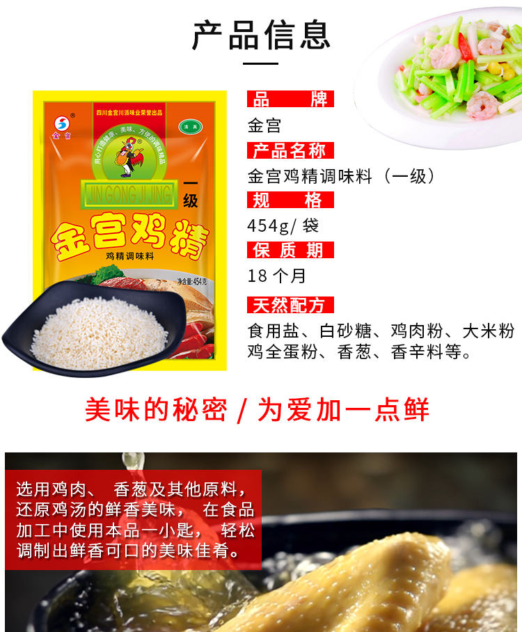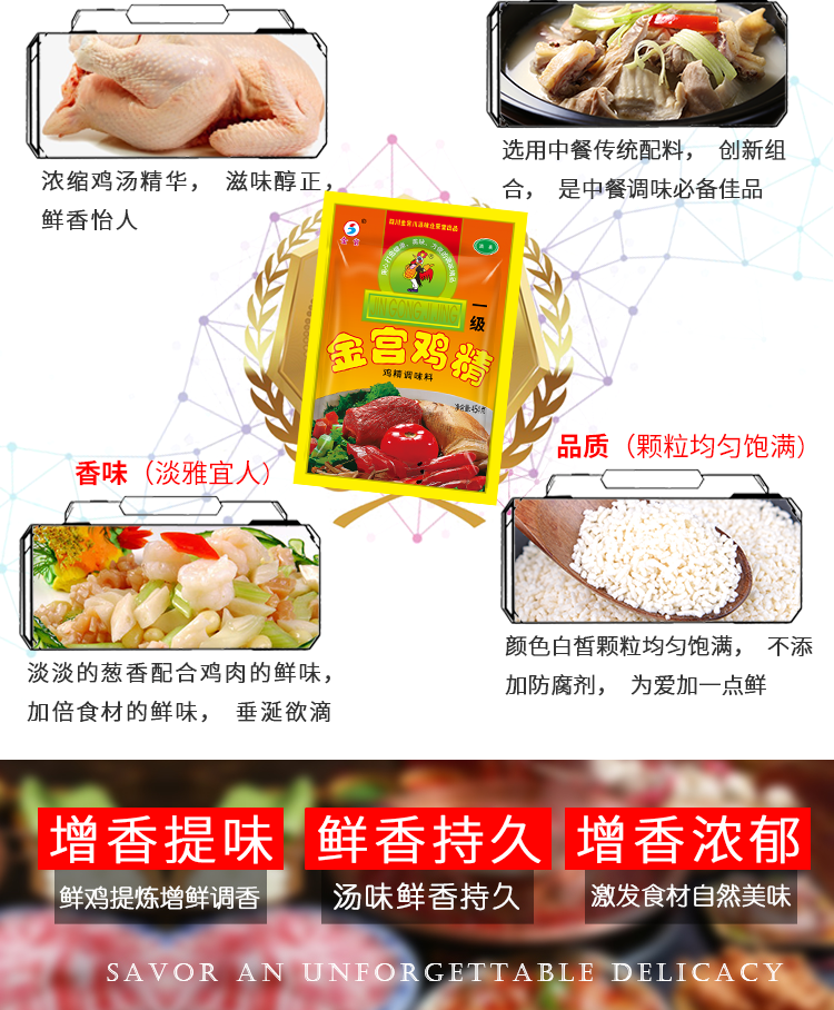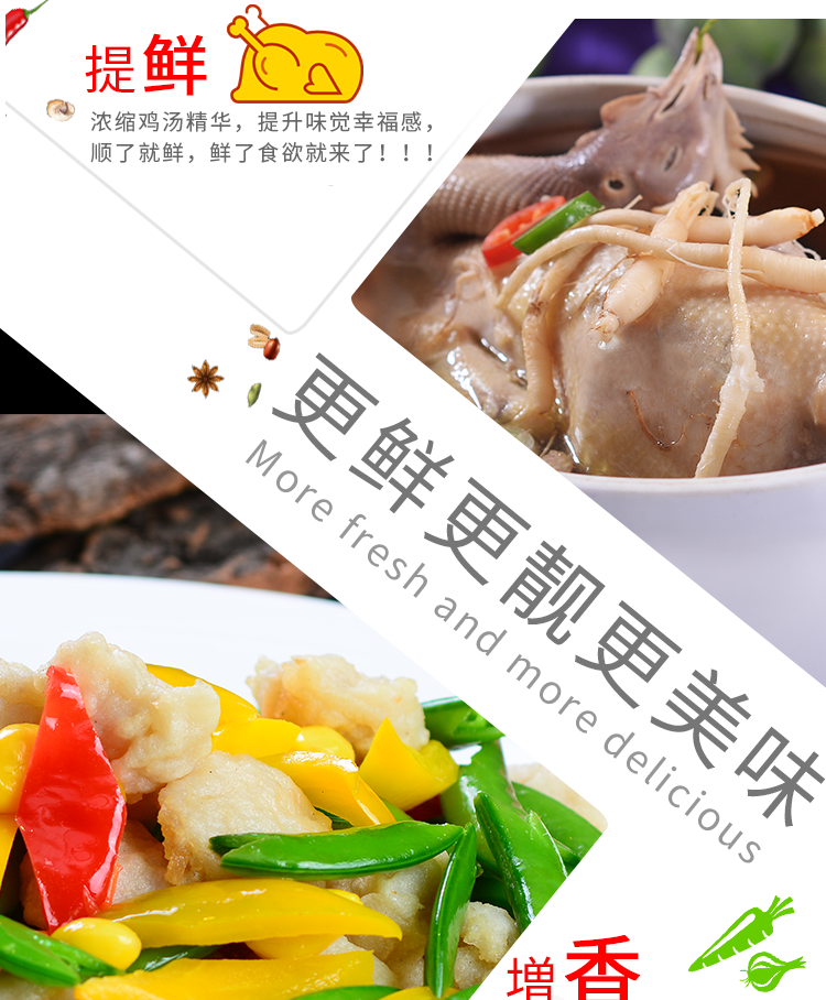 產(chǎn)品簡介:本品采用高科技和新工藝精致而成,具有上等雞湯的精華,味道鮮美、香氣濃郁,是家庭、酒樓、餐飲、火鍋、點心及食品加工的調(diào)味佳品。