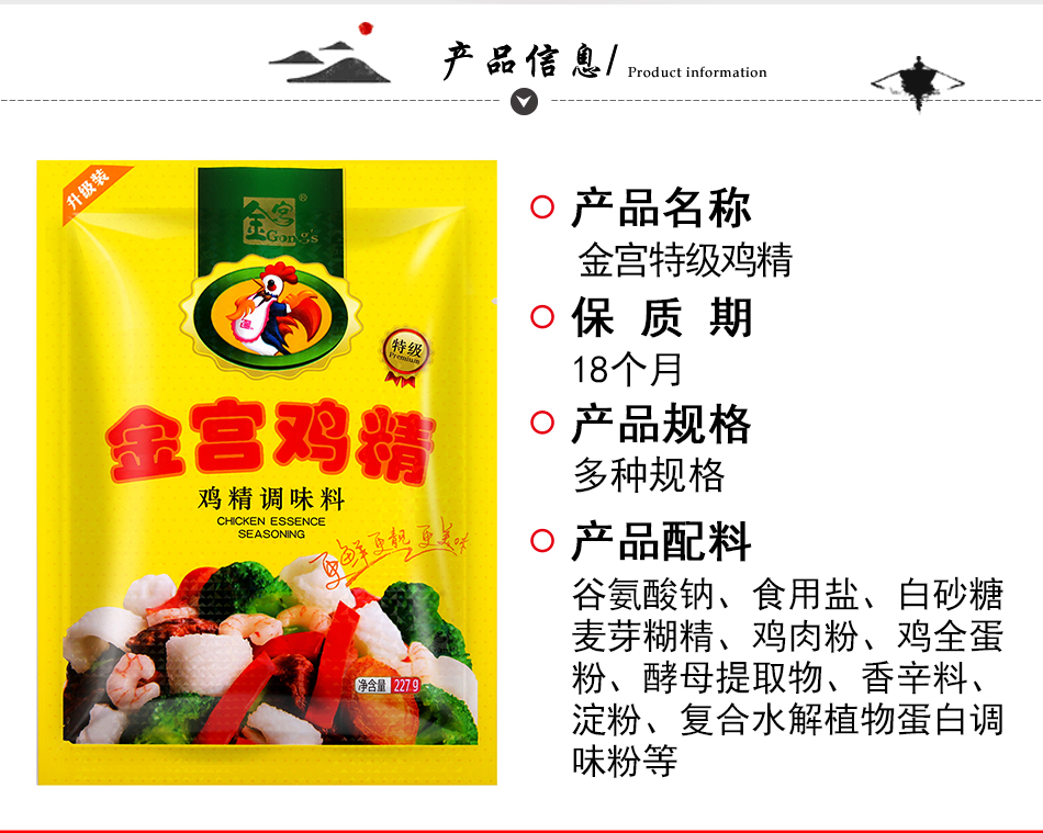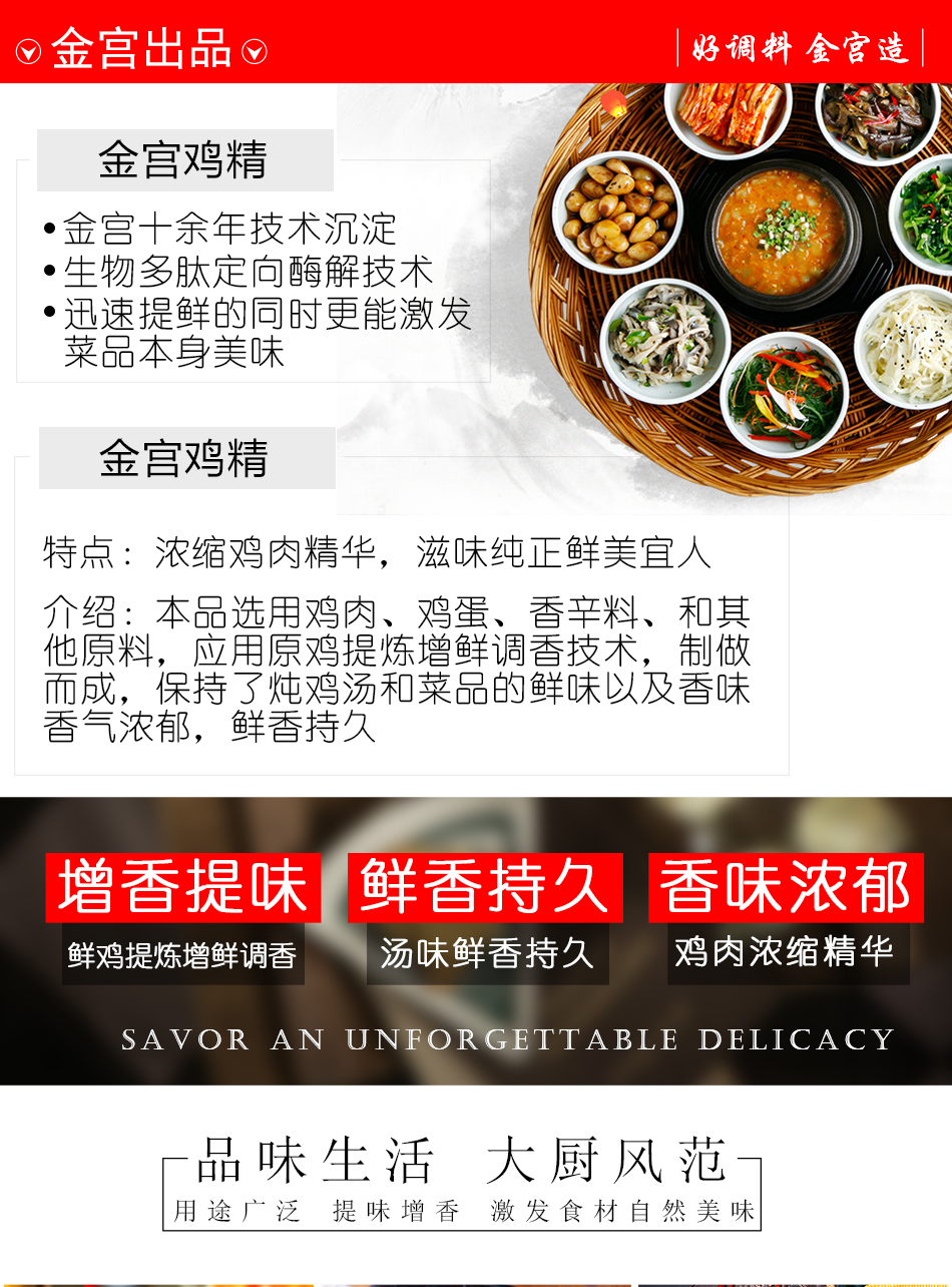 產(chǎn)品簡(jiǎn)介:本品選用土雞、雞蛋及其他優(yōu)質(zhì)原料,經(jīng)金宮資深調(diào)味師系統(tǒng)研究,應(yīng)用高科技和先進(jìn)工藝制成。本品味道鮮美、香氣濃郁、風(fēng)味獨(dú)特,是家庭、酒樓、餐飲、火鍋、點(diǎn)心及食品加工的調(diào)味佳品。