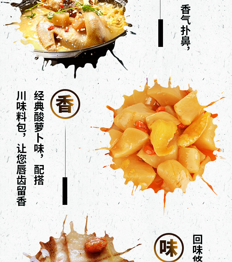 產(chǎn)品簡介:金宮酸蘿卜燉老鴨調(diào)料是金宮川派公司川菜研發(fā)團(tuán)隊(duì)收集四川農(nóng)家用腌漬蘿卜(即酸蘿卜)燉鴨子的方法,精選四川腌漬蘿卜、腌漬生姜、腌漬辣椒等精心煽炒制作而成,烹調(diào)出來的老鴨湯皮糯肉嫩,湯鮮味美、酸香可口。