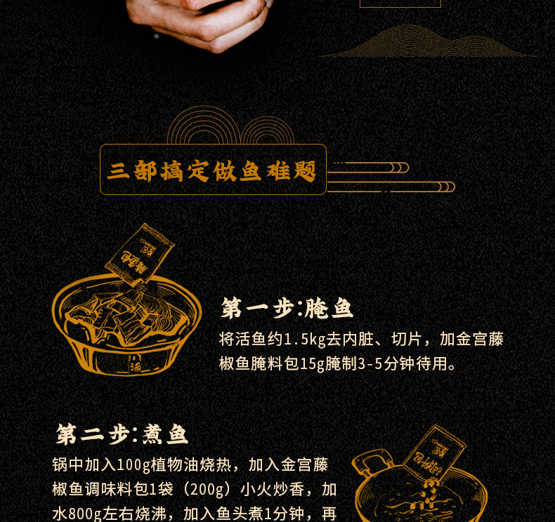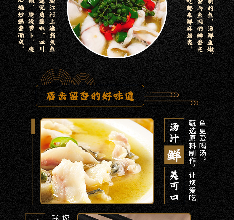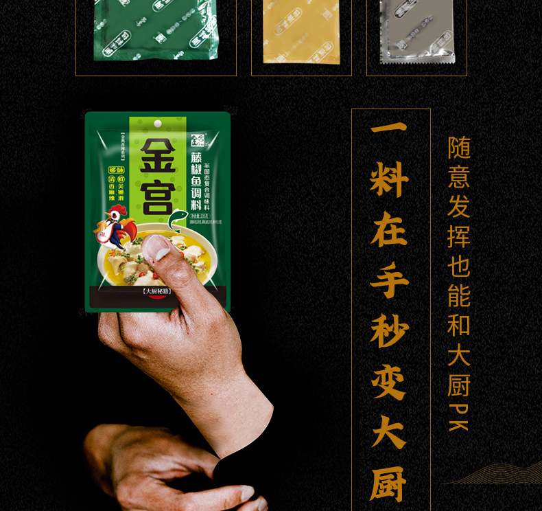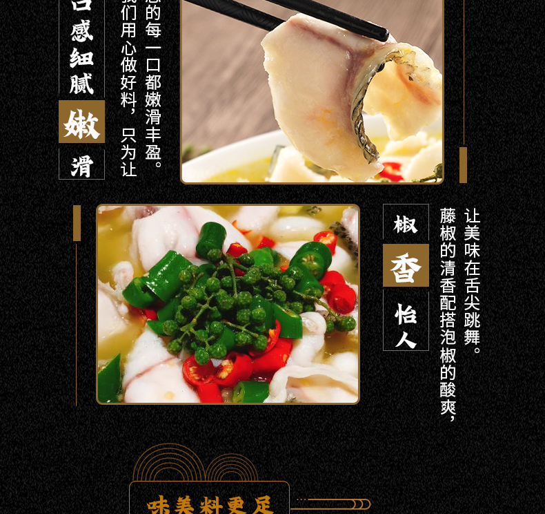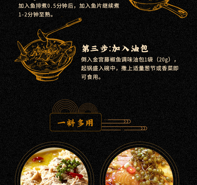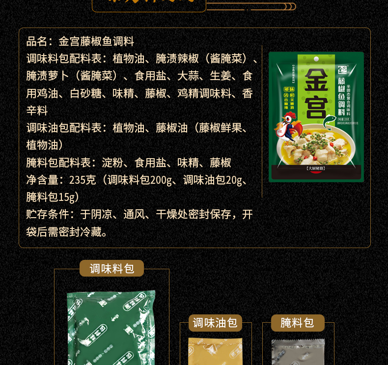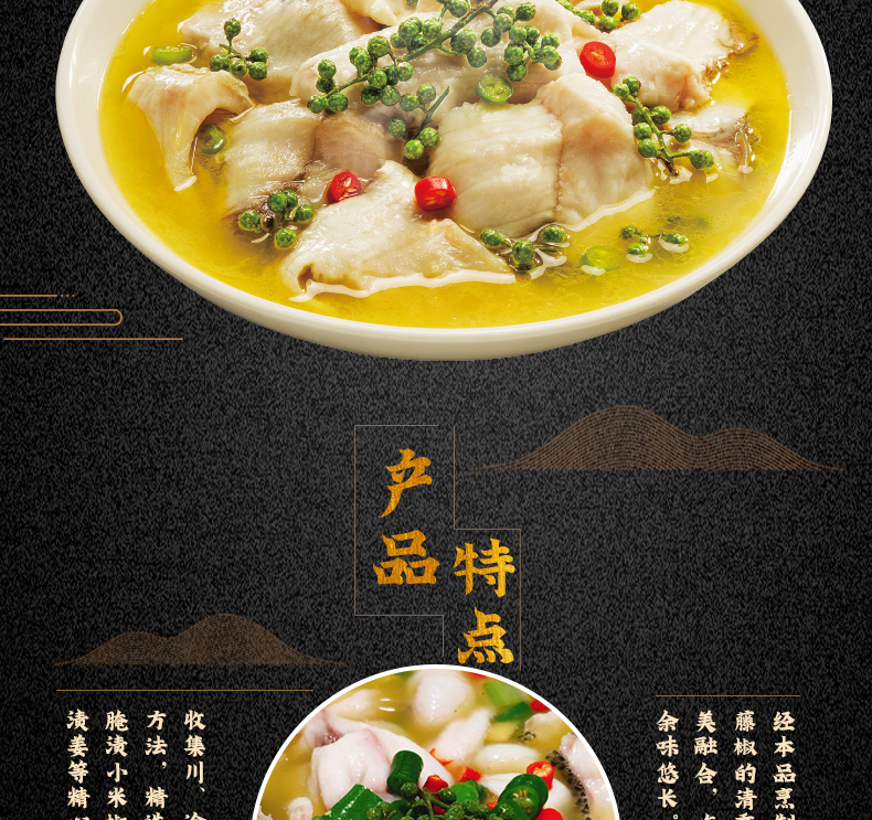 產(chǎn)品簡介:本調(diào)料是金宮川派公司川菜研發(fā)團(tuán)隊(duì)收集川.渝江河上漁翁煮魚的方法,精選優(yōu)質(zhì)藤椒,四川泡小米椒,泡蘿卜,泡姜等精心煽炒爆香而成。經(jīng)本品烹制的魚,湯鮮魚嫩,藤椒的清香與魚肉的鮮香完美融合,吃起來鮮麻勁爽,余味悠長。