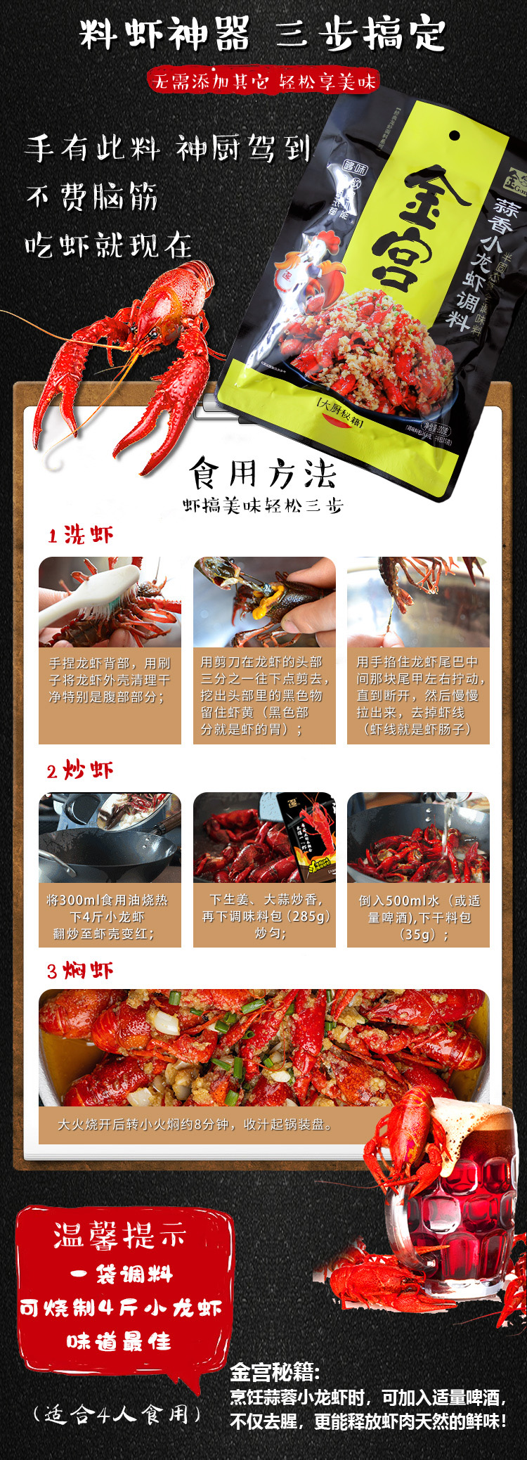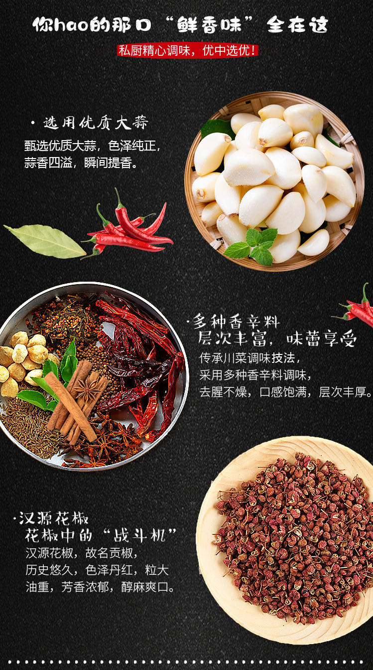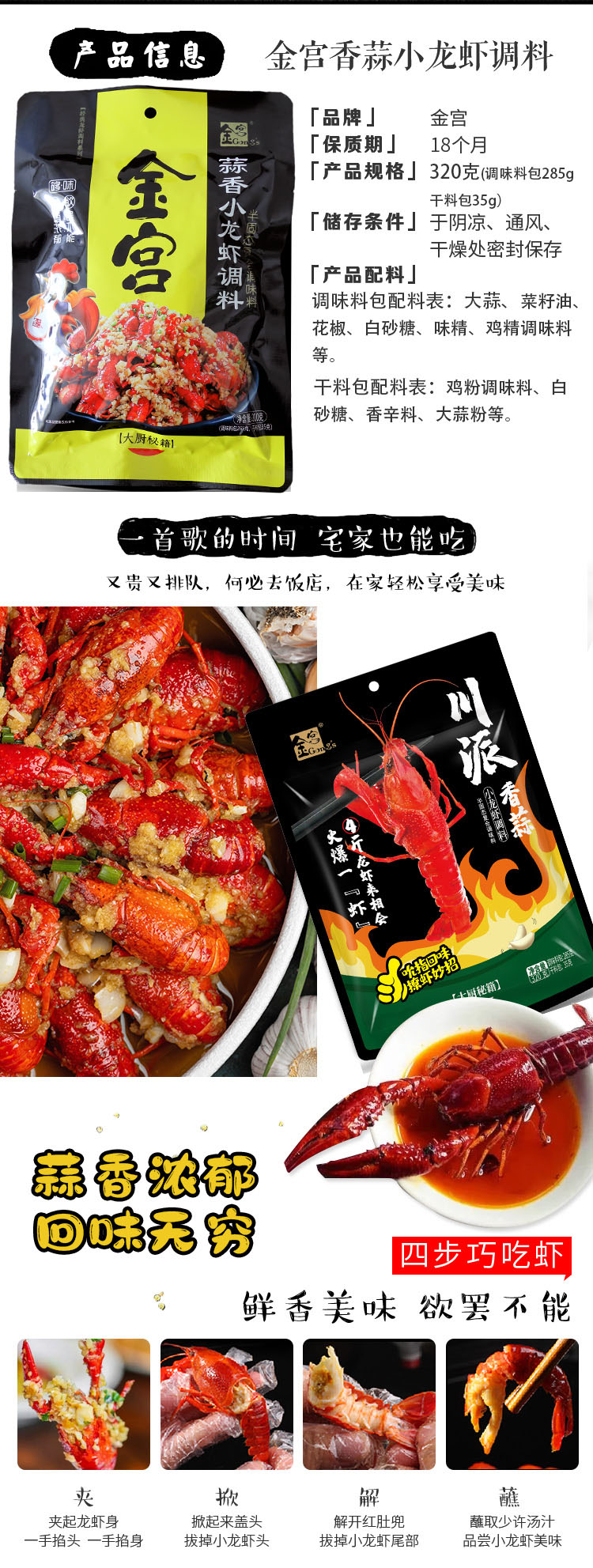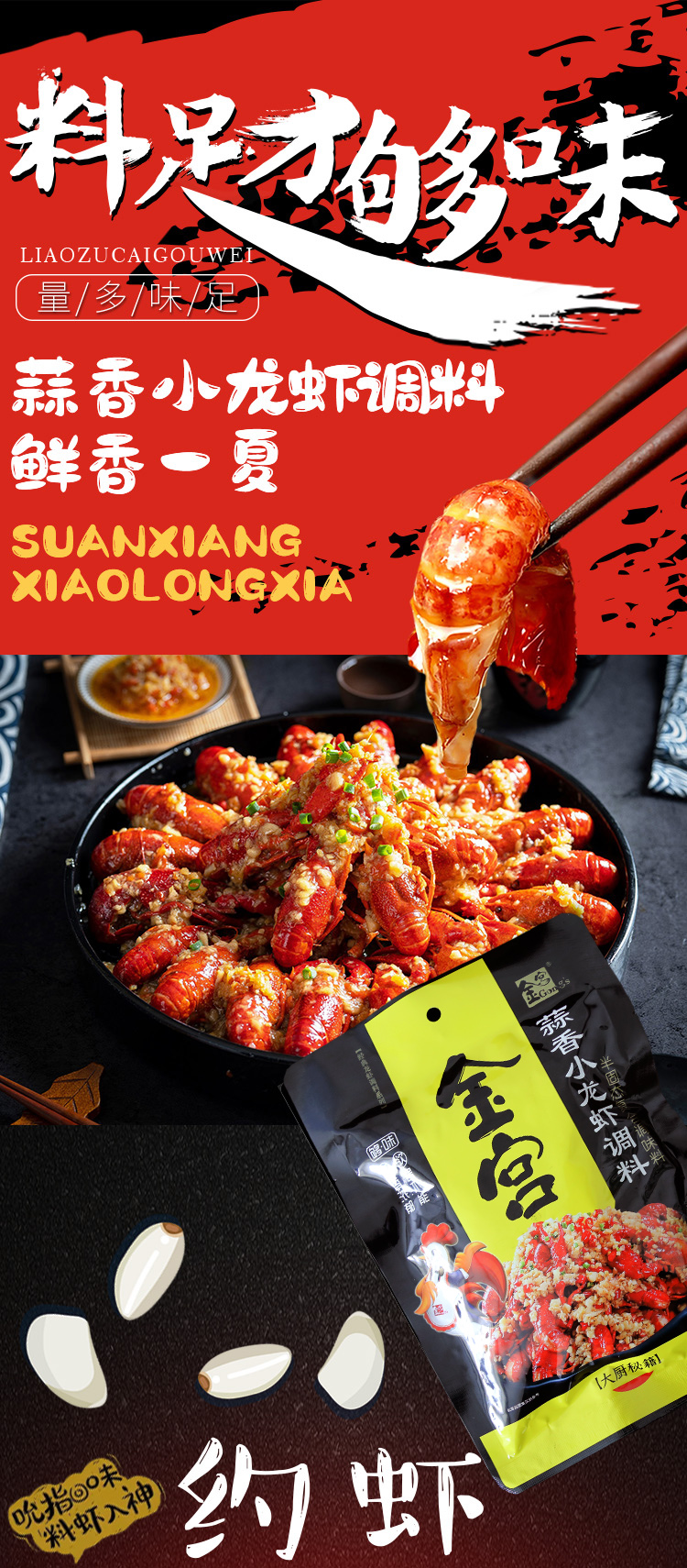 產(chǎn)品簡介:本調(diào)料是金宮川派公司川菜研發(fā)團隊收集川、渝江河上漁翁炒蝦的方法,精選新鮮大蒜、洋蔥、香辛料等煽炒爆香精心制作而成,烹調(diào)出來的小龍蝦外殼紅亮、蝦肉細嫩、蒜香濃郁,食之欲罷不能。