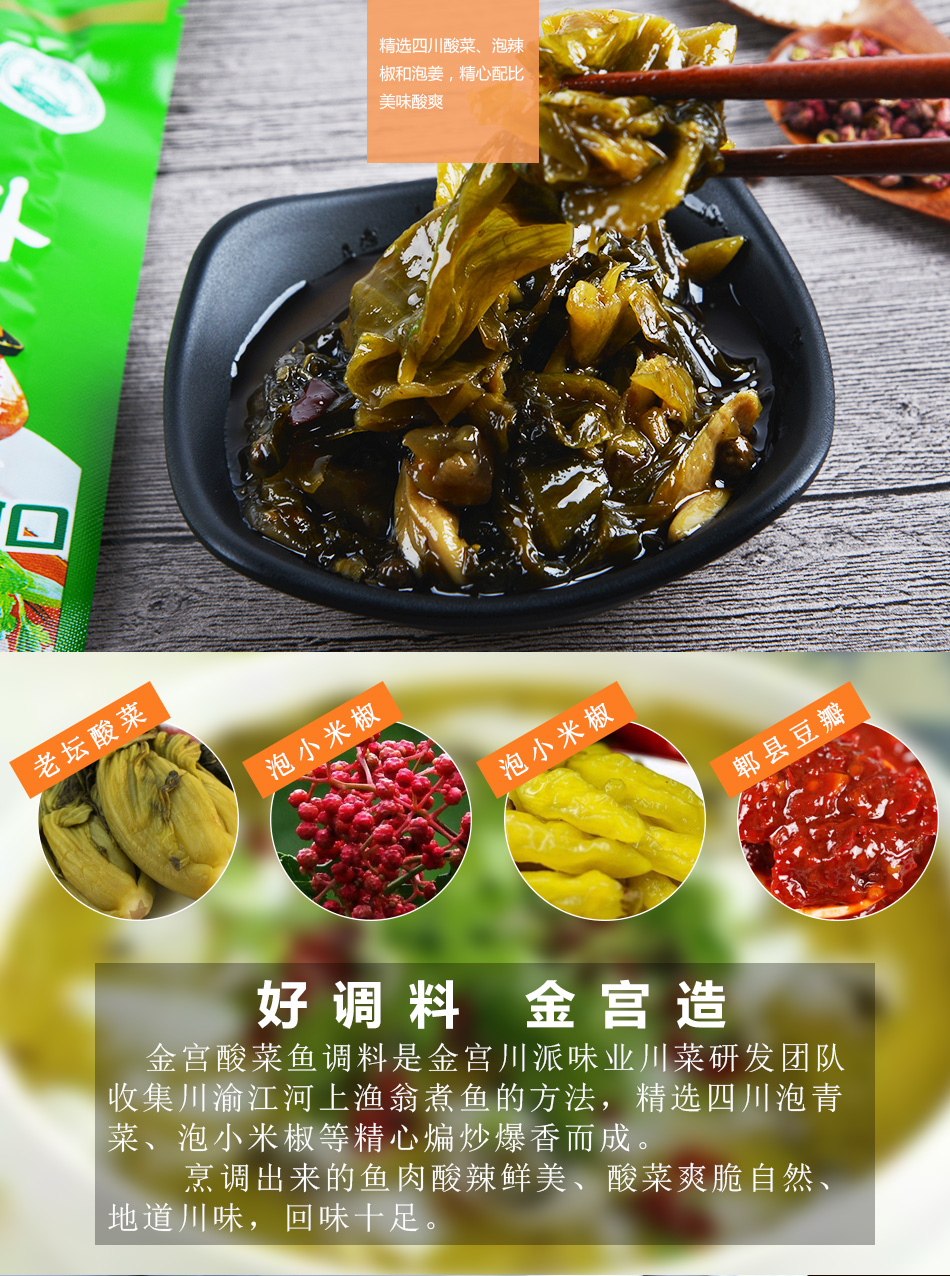 產品簡介:本品為金言川派味業(yè)川菜研發(fā)團隊收集川渝漁笛煮魚技巧。精心調配而成。晴選四川泡菜、優(yōu)質花駔等食材。讓魚肉酸香可口,回味無窮。